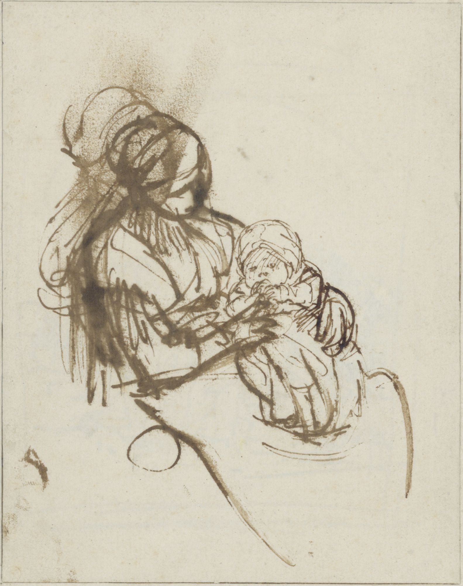 Rembrandt was fascinated by the subject of women and children. He often observed the intimate contact between an infant and his or her mother, wet nurse or maid and captured it on paper – mainly between 1630 and 1640.1 Sketches like this one consequently make up a large part of his drawn oeuvre. A hundred and thirty-five sheets of the ‘lives of women with children by Rembrandt’ (sijnde het vrouwenleven met kinderen van Rembrandt) were in an album owned by the painter Jan van de Cappelle (1626-1679) according to the inventory of his estate drawn up in 1680. Van de Cappelle acquired this album with numerous other drawings by Rembrandt at the sale of Rembrandt’s belongings in 1656.2 This sheet could have been part of that album, which was certainly arranged by Rembrandt. Feeding children,3 teaching them to walk (see cat. 38) or playing games with them,4 are specific activities Rembrandt drew. This sheet of a woman and a child shows a more peaceful moment. The child on the woman’s lap is nestled safely in her arms. The little boy or girl has both hands in front of its mouth, possibly to suck its fingers. The child stares at the artist with eyes wide open – the white of the eyes are depicted emphatically5 – and the viewer is struck by this attentive look. More than just an endearing image, this drawing also provides an interesting insight into the artist’s working methods. Rembrandt probably began by drawing the woman but, when he came to the child, he realized that the distance between their heads was too great.6 He consequently lowered the woman’s head a little and corrected the first lines using his fingers or a dry brush. He also reinforced the outlines of the better placed head by going over it with the pen, without rendering it in any more detail.7 MvS 1Colin B. Bailey and Magnus Olausson et al., Treasures from the Nationalmuseum of Sweden: The Collections of Count Tessin, exh. cat. New York (The Morgan Library & Museum) 2017, no. 53. 2Paris 2004, p. 168. 3For example, the double-sided drawing in Stockholm (Nationalmuseum, inv. no. NMH 2039/1863), Two Studies of Women with Children, mid-1640s, pen and brown ink and wash, 165 × 167 mm. 4A game of ‘Peekaboo’ is being played in a drawing in the collection of the Fondation Custodia, Paris: Three Studies of a Woman with a Child in Her Arms, 1630-40, pen and brown ink, some rubbing with the finger, 187 × 153 mm, inv. no. 4904. 5Schatborn 2010, p. 55. 6Van Berge-Gerbaud 1997, p. 31. 7Schatborn 2010, p. 55.