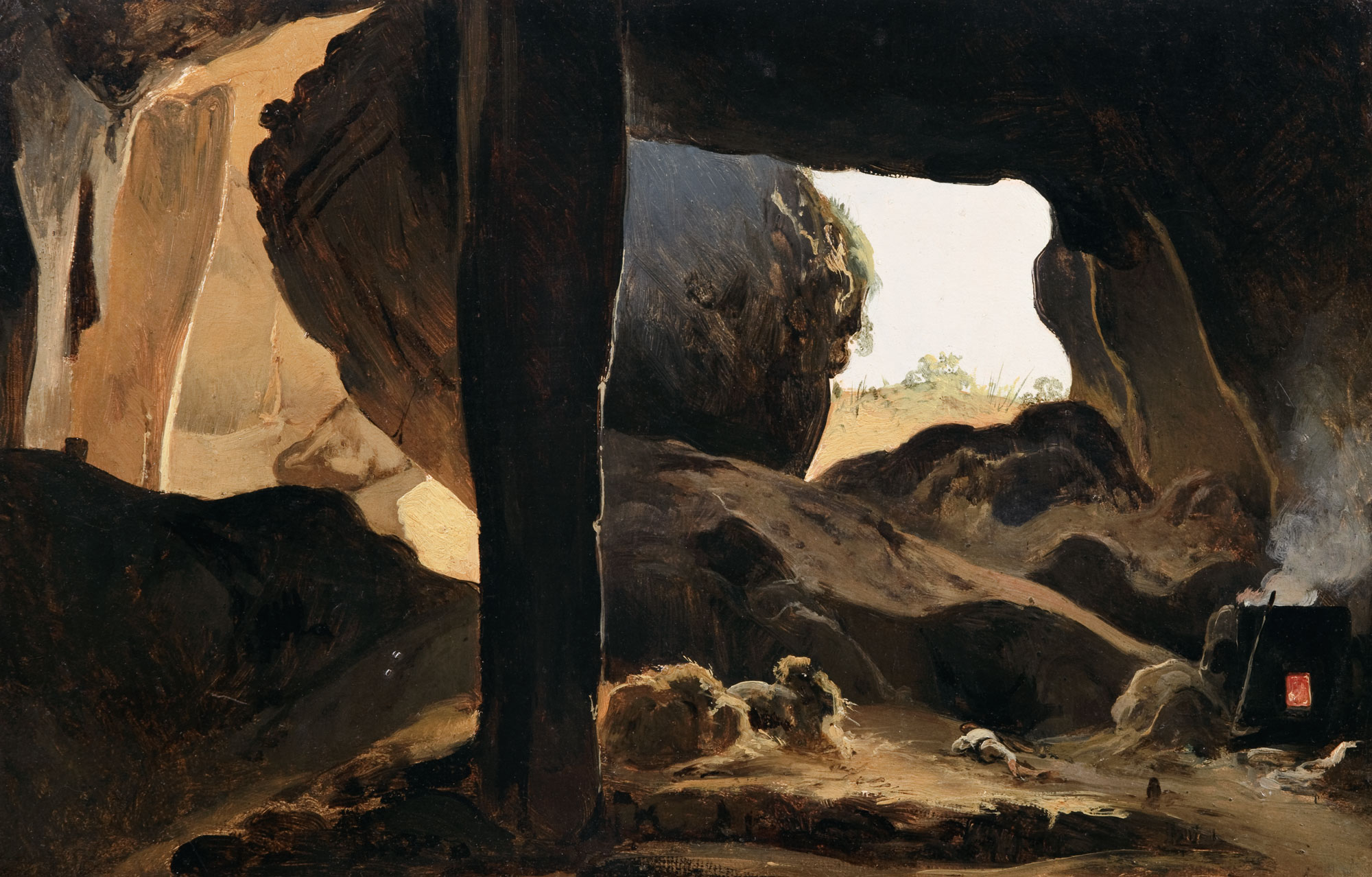 Né en Guadeloupe, à Pointe-à-Pitre, Gibert s’installa à Paris en 1821 et y débuta sa formation avec Guillon-Lethière (1760–1832), lui aussi originaire des Antilles. Il entra ensuite à l’École des Beaux-Arts en 1825. Prix de Rome de paysage historique en 1829, il arriva à la villa Médicis en janvier 1830. Cette étude fut réalisée durant son séjour de trois ans en Italie, au cours duquel il se rendit également à Naples et en Sicile. Elle fait partie d’un groupe d’esquisses à l’huile restées dans la famille de l’artiste et dont on ne découvrit l’existence qu’en 2001. Cet ensemble compte de nombreuses vues de gorges et de grottes. La puissante verticale légèrement décentrée engendre une composition inhabituelle et divise la scène en deux. Sur la gauche, les jeux d’ombre et de lumière dans les recoins de la caverne donnent naissance à un agencement quasi abstrait d’ocres et de bruns. À droite, le jour pénètre dans la grotte et rebondit sur ses parois rocheuses. L’inclusion d’un berger, endormi à même le sol, les pieds nus, et d’un feu qui flamboie à l’intérieur d’un four rappelle la fonction des grottes en tant qu’abris naturels pour l’homme.