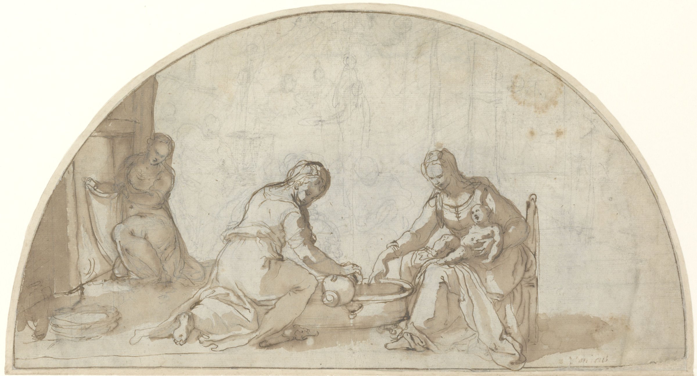 Suivant la tradition iconographique dominante en Italie depuis le XVe siècle, cette représentation de la naissance de la Vierge met en avant le bain donné à la petite Marie, alors que sa mère, sainte Anne, est alitée à l’arrière-plan. La composition est esquissée à la pierre noire, mettant rapidement en place l’espace architectural et quelques silhouettes. Le groupe du premier plan est ensuite redéfini à l’encre brune par l’auteur du dessin. Cette feuille ne présente aucune correspondance directe avec les peintures connues de Salimbeni, mais elle s’apparente à ses études pour des lunettes ou des retables illustrant le même sujet. Occupant la moitié inférieure de la feuille, nous retrouvons dans ces œuvres les mêmes types de figures féminines, dont l’artiste faisait varier les positions et les dispositions, offrant ainsi une grande variété de solutions narratives.