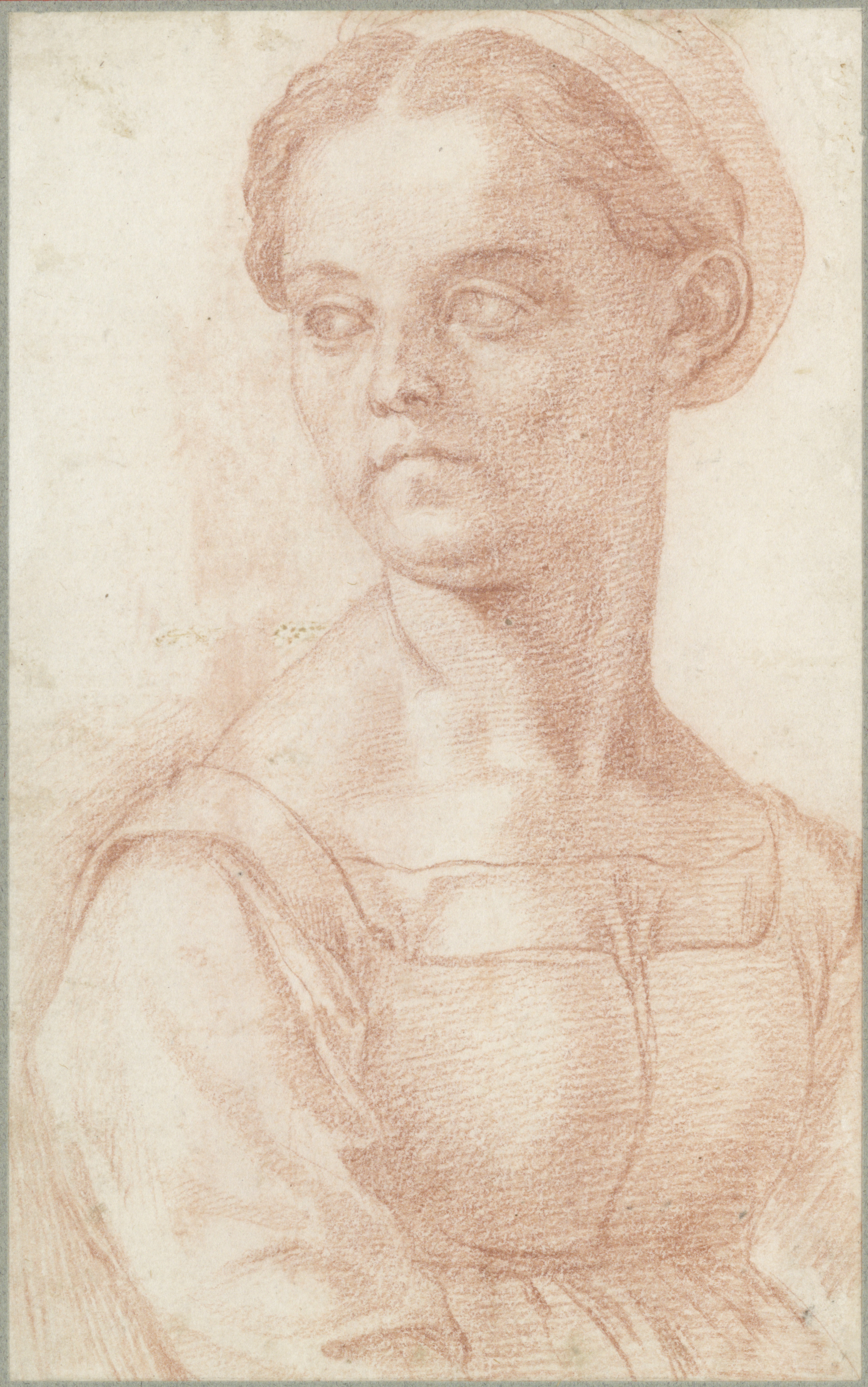 This drawing was executed by Baccio Bandinelli, a Florentine sculptor and goldsmith, follower of Michelangelo. Always attentive to the distribution of light and shade, he used red chalk with care, drawing clear contours and unfolding a tight network of fine, parallel hatchings. The features of the young woman (wavy hair, large eyes and a somewhat heavy chin and neck), depicted on both sides of the sheet, can be recognised in a number of other similar drawings by the artist. These studies can seldom be connected to any sculpture or painting by Bandinelli; they were probably produced for themselves, as exercises in virtuosità, to practise a successful effect or to train the hand and eye. In these drawings, the view point, the position of the head, the orientation of the gaze, even the expression differ: this variation in repetition allows the draughtsman endless scope with his experiments.