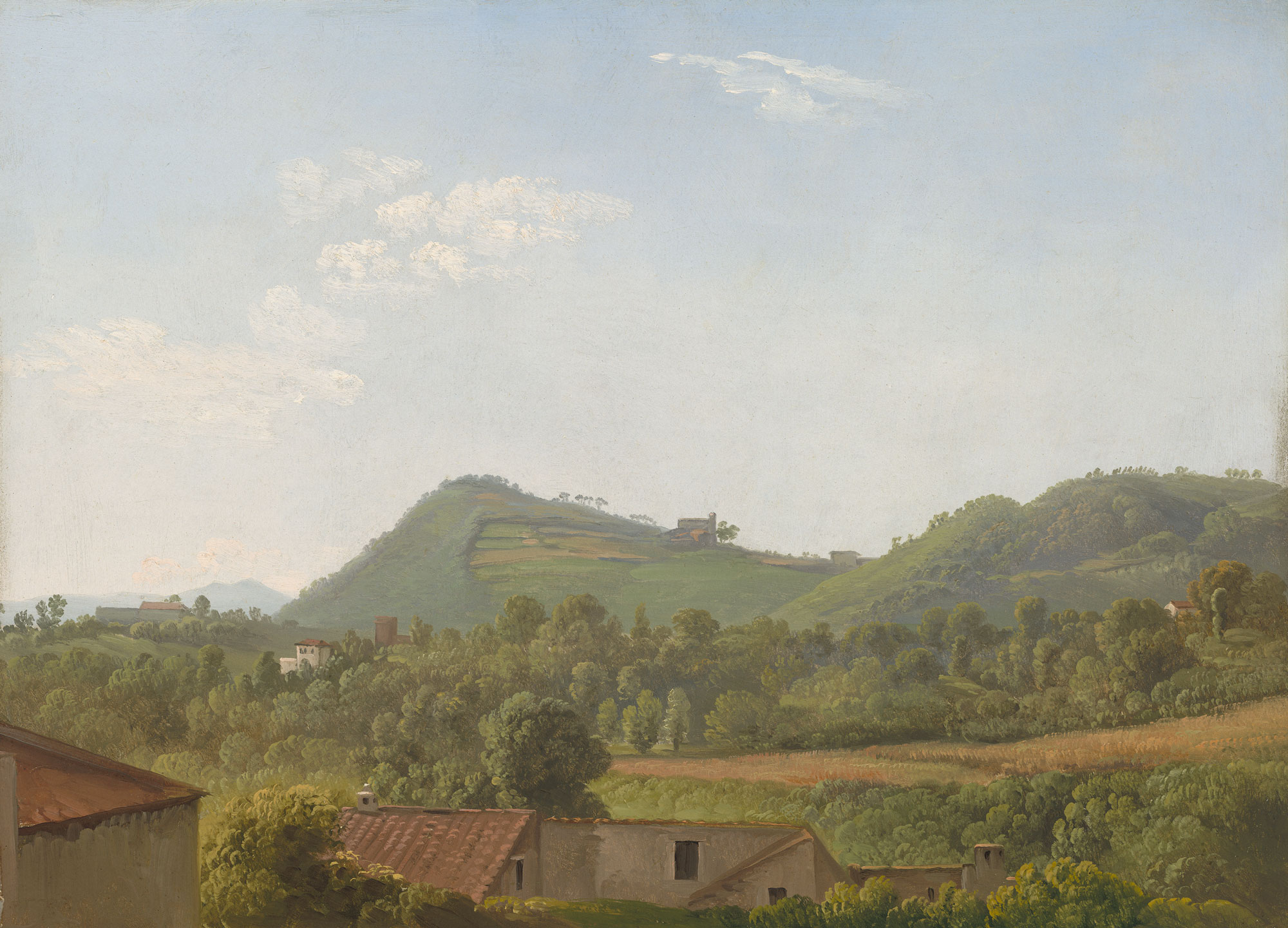 Having moved to Naples around 1801-03, Simon Denis was appointed court painter to Joachim Murat, King of Naples, in 1808 and spent the rest of his life in the city. His official commissions consisted mostly of monumental views of the Neapolitan landscape. In his oil sketches however, Denis had a predilection for decidedly common subjects and unusual points of view. This nondescript hilly landscape has been identified as Gragnano, a village inland from Castellammare to the south of Naples. The iconic Vesuvius occupies a marginal position, relegated to the hazy distance in the far-left background. The lively variety of the painter’s touch creates a sense of freshness and immediacy in his rendering of the wooded countryside and the subtleties of outdoor light.