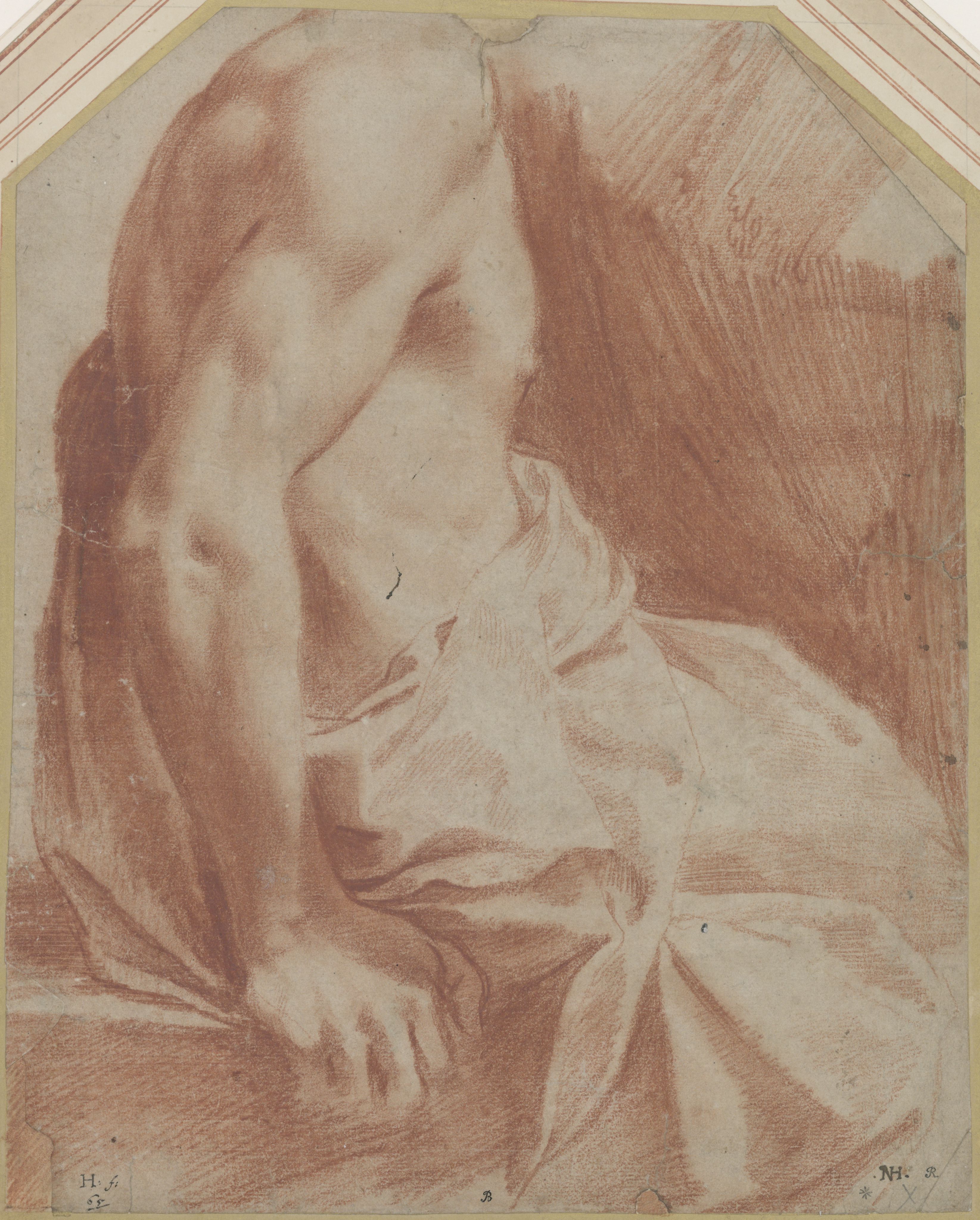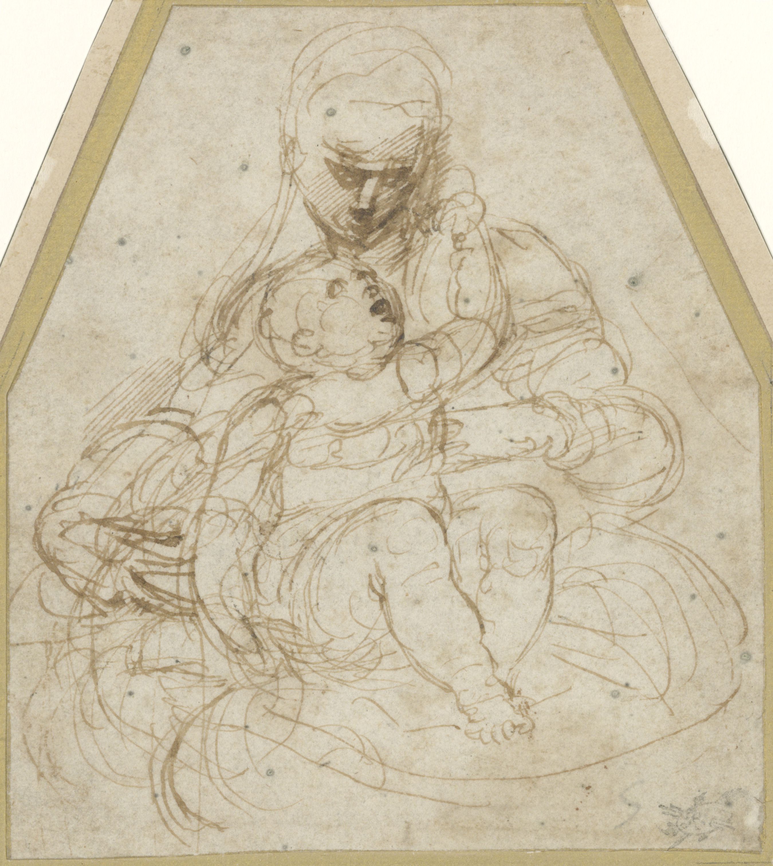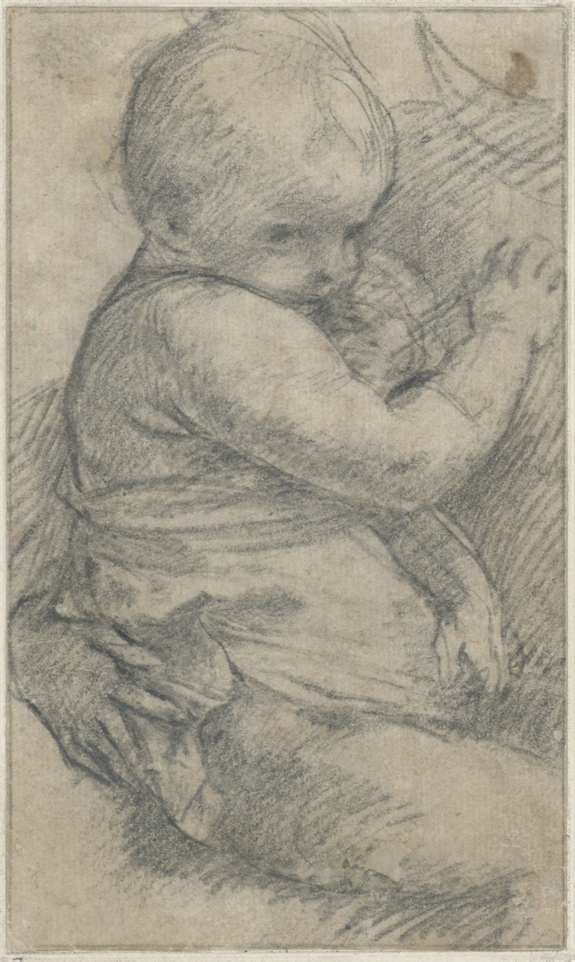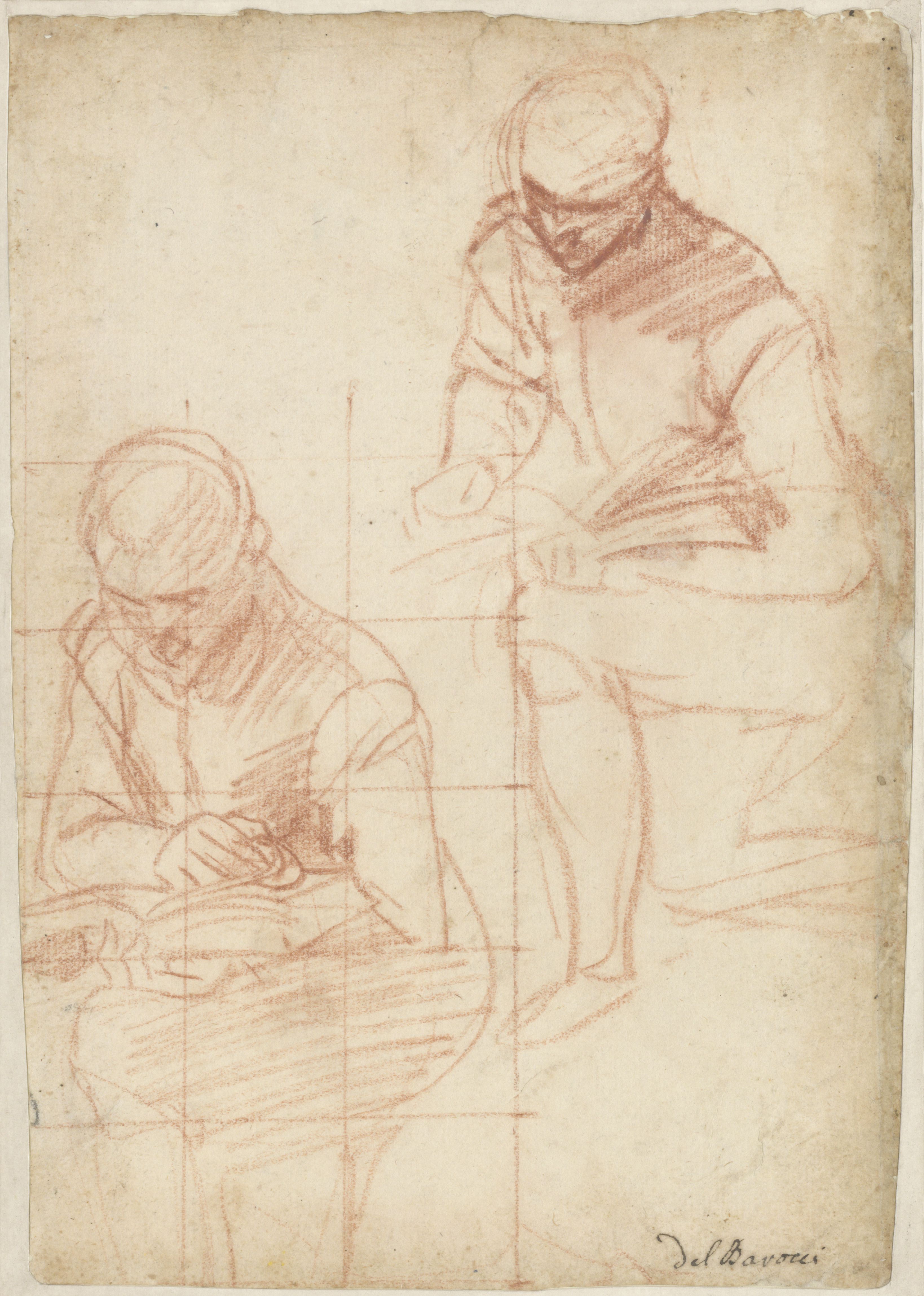 Accueil Catalogues en ligne Studi & Schizzi Introduction C’est à Florence, au XVe siècle, que les premiers traités artistiques virent le jour. Dès le siècle suivant, les théoriciens tels que Giorgio Vasari (1511 – 1574) affirmèrent la primauté du dessin, essentiel dans le processus de création, autant que dans la formation des artistes. En italien, disegno désignait aussi bien le projet intellectuel d’une œuvre (dessein) que son exécution formelle (dessin). Federico Zuccari (v. 1540 – 1609) distinguait ainsi le disegno interno, image mentale, et le disegno esterno, image matérialisée. La représentation de la figure humaine fut une préoccupation majeure de la Renaissance et fit l’objet d’un intérêt constant dans l’art italien au cours des siècles. Cherchant à atteindre une narration idéale dans une image qui, par nature, est immobile, les peintres s’attachèrent à représenter des personnages dans des proportions et des attitudes éloquentes. Transcription la plus immédiate et spontanée de l’inspiration des artistes, le dessin leur permettait d’explorer différentes solutions formelles. Du premier geste des esquisses – schizzi – rapidement tracées sur le papier, aux études – studi – plus soignées, les dessins sont de précieux témoignages du cheminement de l’esprit de l’artiste. En 1962, Frits Lugt présentait l’acte de dessiner comme une « confession involontaire », par laquelle nous surprenons le peintre dans ses réflexions. « On partage ses pensées, on se heurte avec lui aux difficultés, on admire la manière dont il parvient à les vaincre. » Comment définir la position des modèles et les liens qui les unissent ? Comment disposer ces figures dans un espace correspondant à celui de l’œuvre future ? Comment traduire les effets d’ombre et de lumière sur les corps ? Grâce aux œuvres issues des collections de la Fondation Custodia, l’exposition invite à observer les dessins, y déceler les indices révélateurs des recherches et des intentions des maîtres italiens. I. Étudier la figure La figure humaine a toujours occupé une position privilégiée dans l’esprit des artistes. À la Renaissance, quand l’Humanisme plaça l’homme au centre du monde, sa représentation devint un enjeu majeur de la création artistique. Les artistes cherchèrent à comprendre la façon dont un corps se meut et agit, pour donner aux personnages de leurs œuvres un caractère plus réaliste et éloquent. Les traités et les académies artistiques qui se développaient en Italie au XVIe siècle prônèrent l’étude des figures d’après nature, c’est-à-dire basée sur l’observation d’un modèle vivant, qui devint une pratique centrale au sein des ateliers.Dessiner chaque figure de manière particulière constituait aussi bien l’une des étapes préliminaires à la réalisation d’une peinture qu’un exercice pour entraîner l’œil et la main. Les pentimenti (repentirs), le dédoublement des lignes, les reprises et les variations de tout ou partie d’un corps, juxtaposées sur un même support ou répétées d’une feuille à l’autre, sont autant de signes montrant le dessinateur qui s’évertue à perfectionner l’anatomie et à expérimenter l’expressivité d’une attitude ou d’un mouvement. Schizzo (i) : dicono i Pittori quei leggerissimi tocchi di penna o matita, con i quali accennano i lor concetti senza dar perfezzione alle parti ; il che dicono schizzare Esquisse (s) : sont ainsi appelés par les peintres les très légers tracés de plumes ou de crayons avec lesquels ils évoquent leurs concepts sans en perfectionner les parties ; ce qu’ils appellent esquisser Studio (i) : termine de’ Pittori, e Scultori, col quale denominano tutti i disegni o modelli, cavati dal naturale, co’ quali si preparano a far le loro opere ; poichè mediante questi, che essi chiamano studi, vengono a determinare, e perfezionare l’Idea di quella cosa, che vogliono, o con pennello, o con scarpello, rappresentare in pittura o scultura Étude (s) : terme des peintres et des sculpteurs par lequel ils désignent tous les dessins ou modèles tirés de la nature, avec lesquels ils se préparent à faire leurs œuvres ; car par l’intermédiaire de ce qu’ils appellent études, ils parviennent à déterminer et à perfectionner l’Idée de ce qu’ils veulent, avec le pinceau ou le ciseau, représenter en peinture ou en sculpture Filippo Baldinucci, Vocabolario Toscano dell’Arte del Disegno, Florence, 1681 1. Federico Barocci Tête d’un homme barbu, inclinée vers la droite et étude de sa main, années 1590 2. Filippino Lippi Trois études d’un jeune homme portant un manteau 3. Mariotto Albertinelli Huit études d’enfants nus 4. Giovanni Francesco Barbieri, dit Guercino Cinq études pour Marie-Madeleine, vers 1620 5. Andrea del Sarto Études pour la tête, le torse et le bras droit d’un garçon, vers 1526 6. Federico Barocci Deux études d’un homme agenouillé, vers 1605-1608 7. Federico Barocci Deux études de femmes et une étude de draperie, entre 1575 et 1579 8. Baccio Bandinelli Portrait d’une jeune femme le regard baissé. Verso : Portrait du même modèle, regardant derrière son épaule 9. Federico Zuccari Deux études de tête : Vincenzo Borghini, vers 1575-1579 10. Giovanni Francesco Barbieri, dit Guercino Deux études pour la tête de la Vierge, vers 1654 11. Anonyme italien fin, du XVIe siecle Allégorie de la Charité (?) 12. Francesco Salviati Figure féminine drapée, en pied : Salomé, avant 1541 13. Giuseppe Cesari, dit il Cavalier d’Arpino Sibylle persique, vers 1593-1595 14. Ludovico Carracci Un moine assis avec un livre 15. Jacopo Chimenti, dit Jacopo da Empoli Un moine agenouillé en prière : saint François, vers 1590 16. Francesco Curradi Un homme barbu, assis, tourné vers la gauche 17. Andrea del Sarto Étude d’un enfant dans les bras de sa mère, entre 1524 et 1526 18.