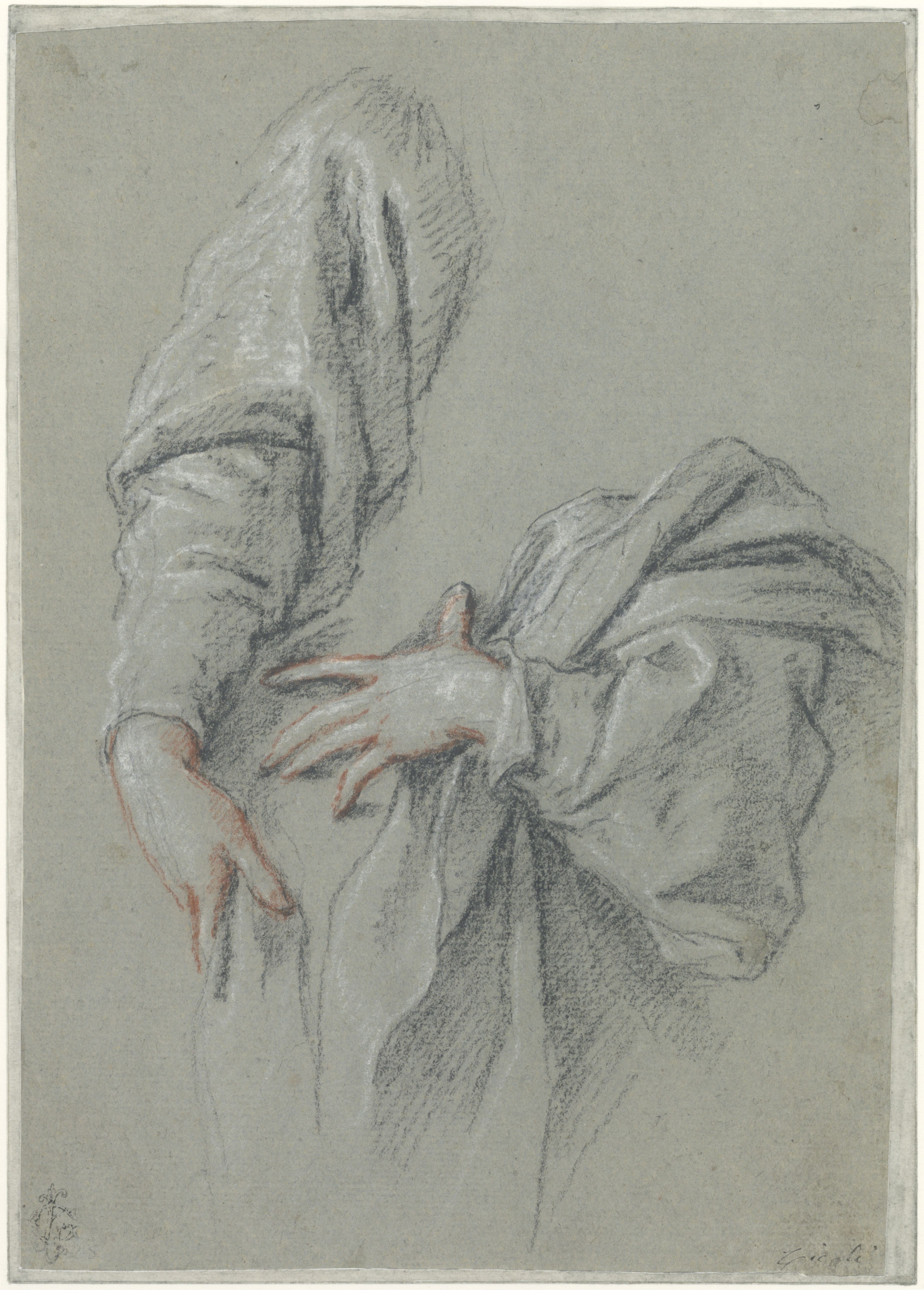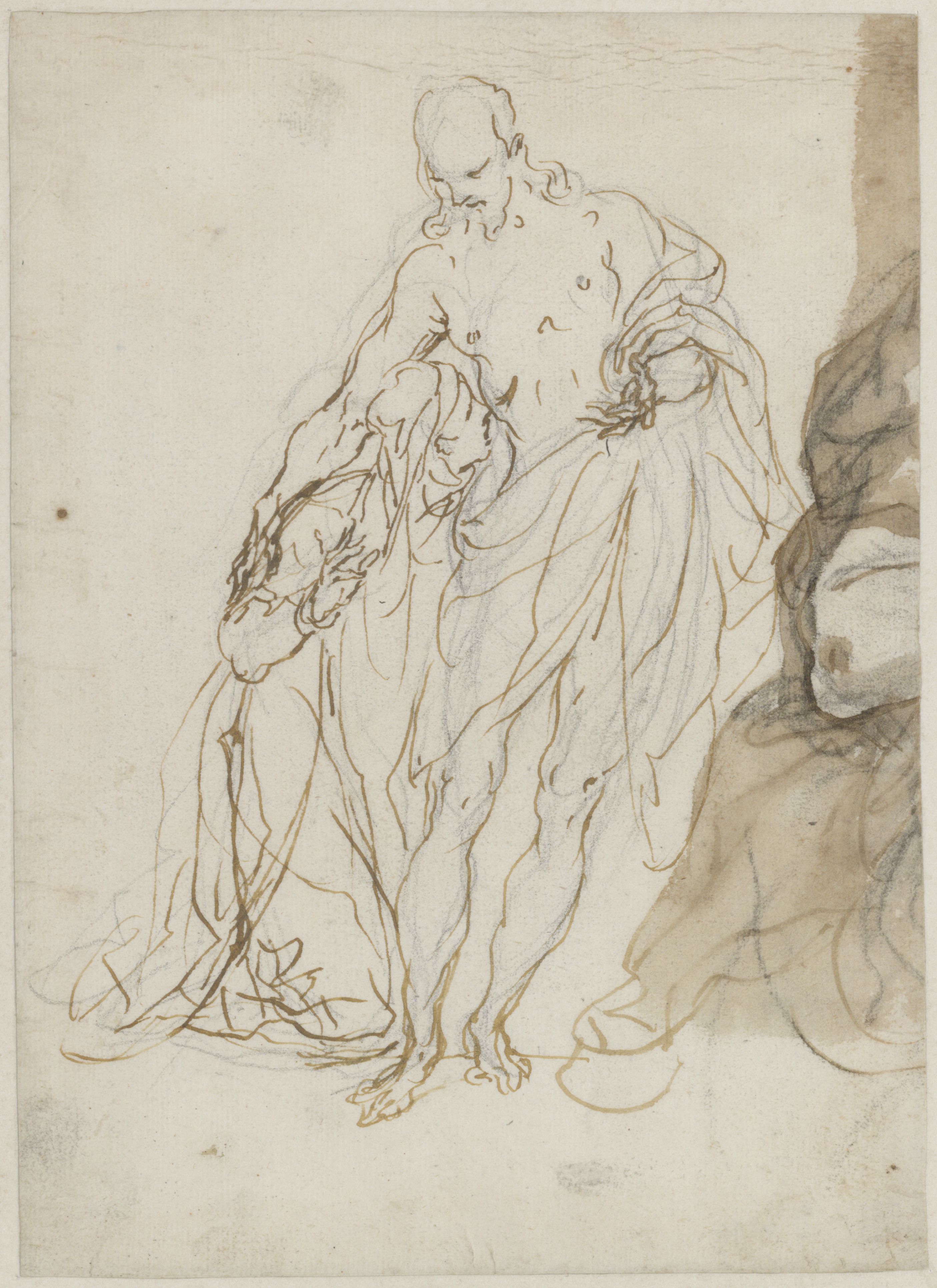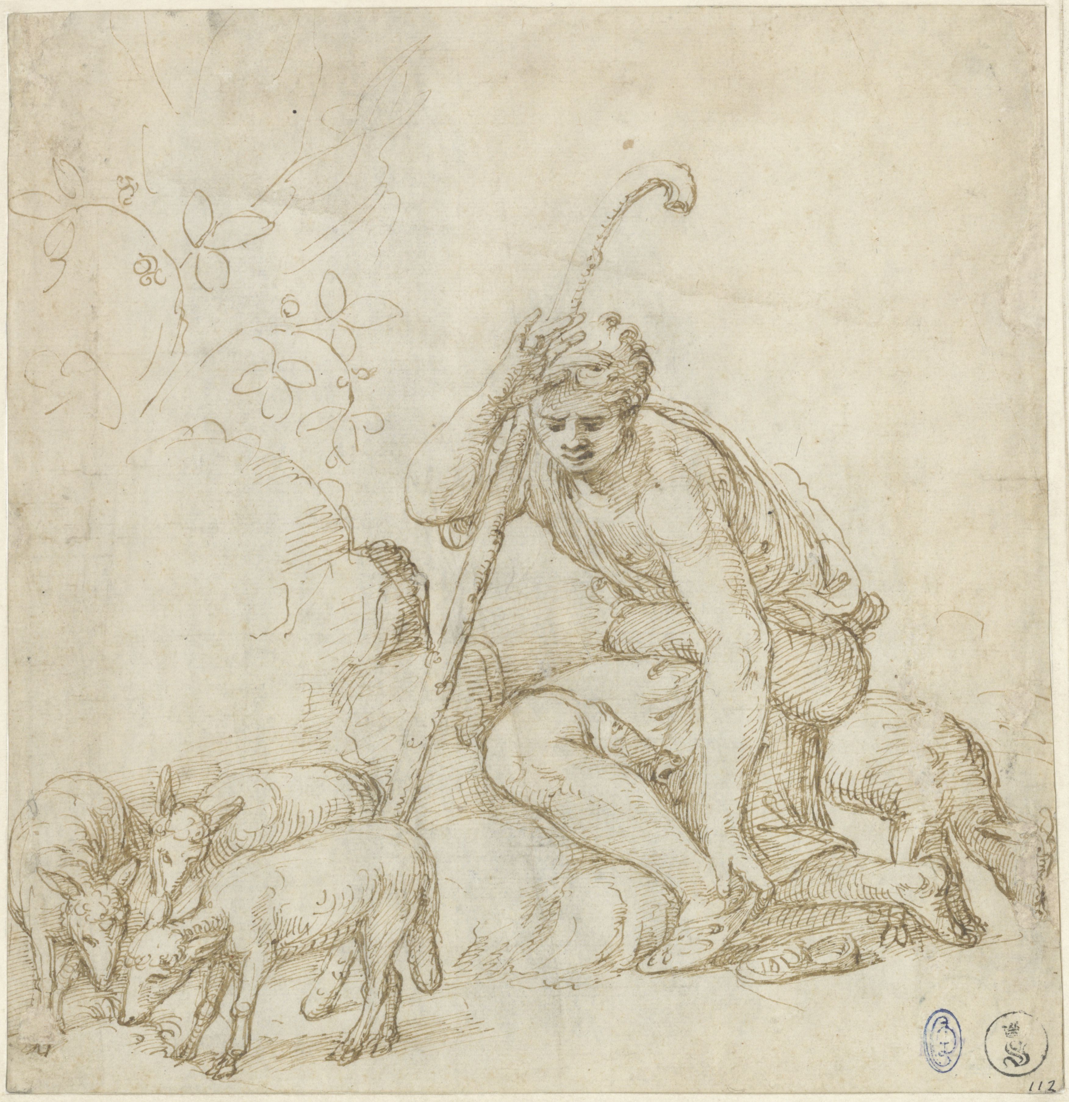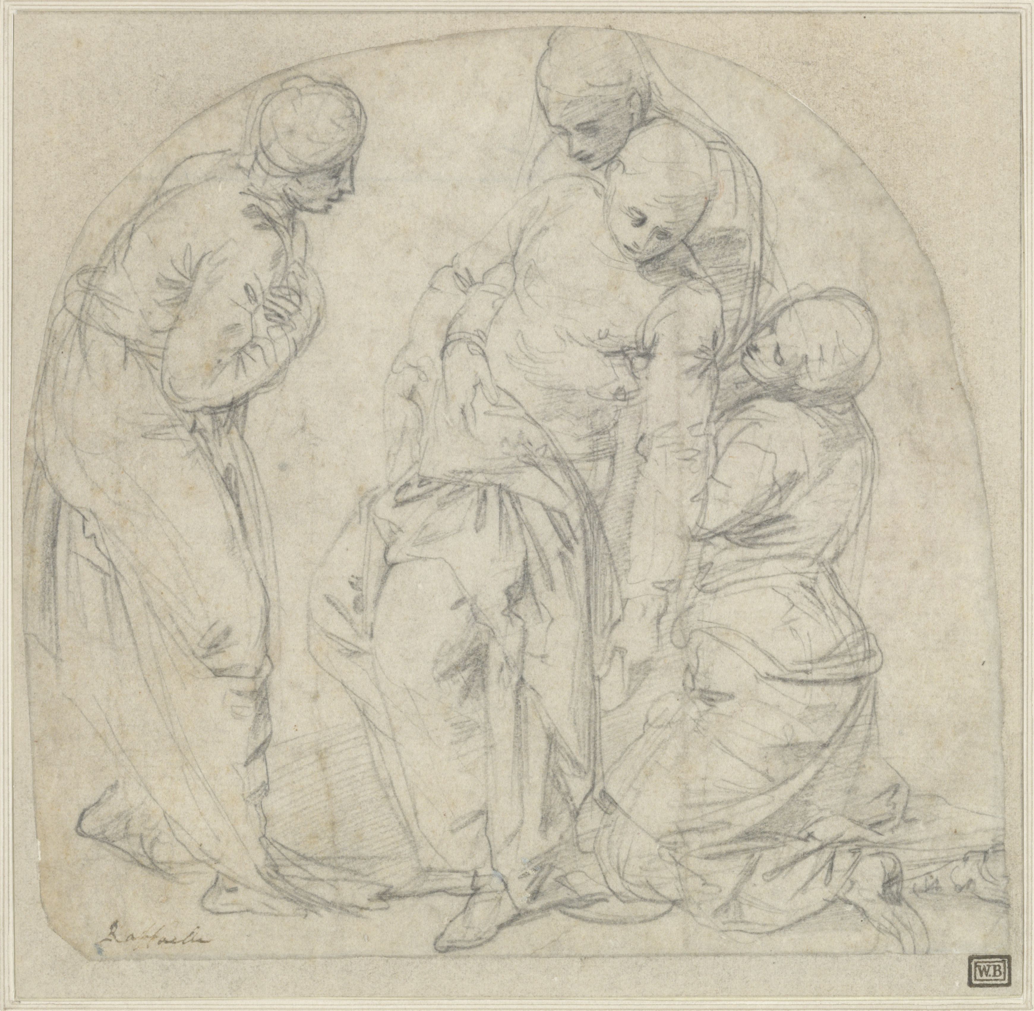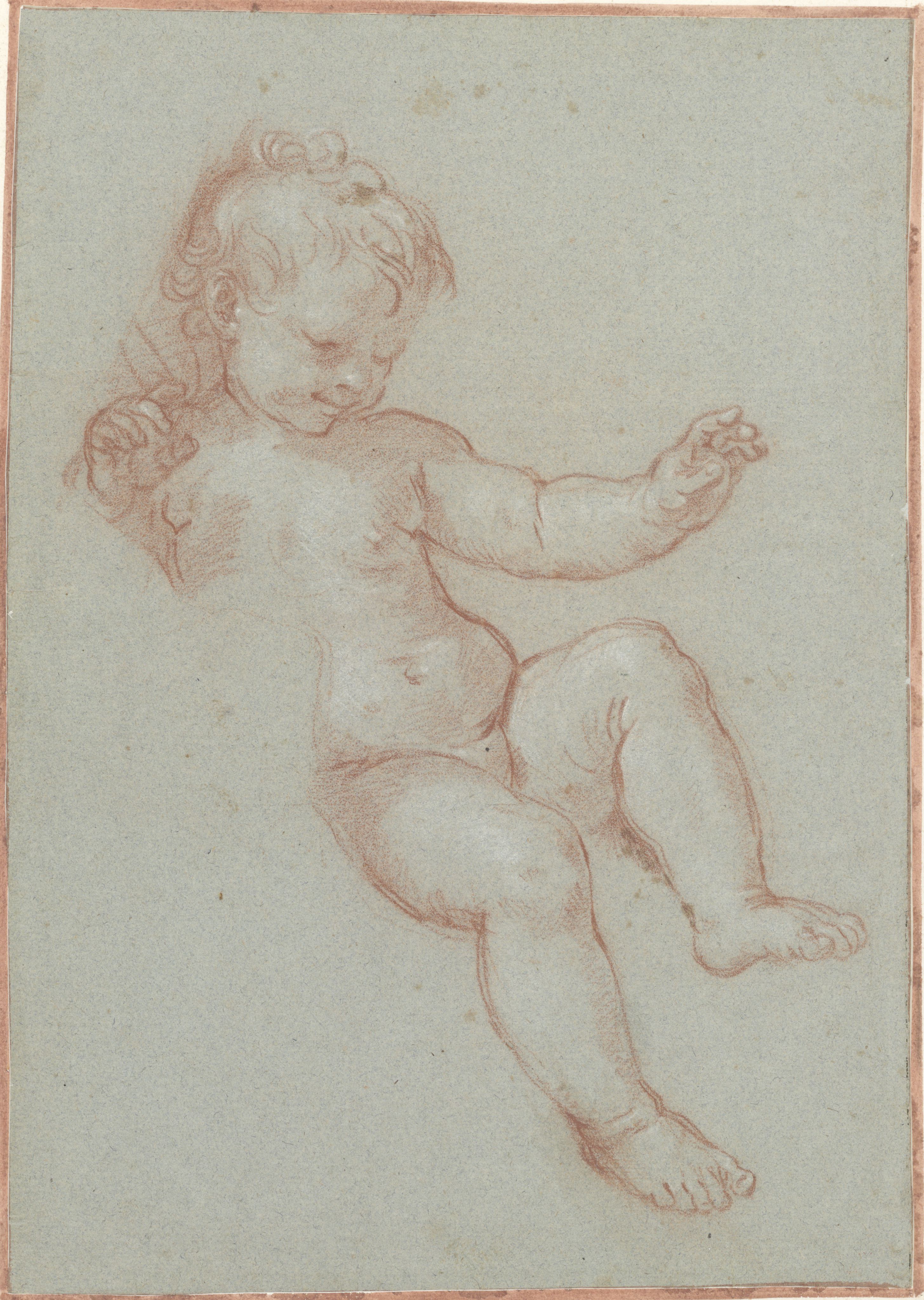 Accueil Catalogues en ligne Studi & Schizzi Introduction C’est à Florence, au XVe siècle, que les premiers traités artistiques virent le jour. Dès le siècle suivant, les théoriciens tels que Giorgio Vasari (1511 – 1574) affirmèrent la primauté du dessin, essentiel dans le processus de création, autant que dans la formation des artistes. En italien, disegno désignait aussi bien le projet intellectuel d’une œuvre (dessein) que son exécution formelle (dessin). Federico Zuccari (v. 1540 – 1609) distinguait ainsi le disegno interno, image mentale, et le disegno esterno, image matérialisée. La représentation de la figure humaine fut une préoccupation majeure de la Renaissance et fit l’objet d’un intérêt constant dans l’art italien au cours des siècles. Cherchant à atteindre une narration idéale dans une image qui, par nature, est immobile, les peintres s’attachèrent à représenter des personnages dans des proportions et des attitudes éloquentes. Transcription la plus immédiate et spontanée de l’inspiration des artistes, le dessin leur permettait d’explorer différentes solutions formelles. Du premier geste des esquisses – schizzi – rapidement tracées sur le papier, aux études – studi – plus soignées, les dessins sont de précieux témoignages du cheminement de l’esprit de l’artiste. En 1962, Frits Lugt présentait l’acte de dessiner comme une « confession involontaire », par laquelle nous surprenons le peintre dans ses réflexions. « On partage ses pensées, on se heurte avec lui aux difficultés, on admire la manière dont il parvient à les vaincre. » Comment définir la position des modèles et les liens qui les unissent ? Comment disposer ces figures dans un espace correspondant à celui de l’œuvre future ? Comment traduire les effets d’ombre et de lumière sur les corps ? Grâce aux œuvres issues des collections de la Fondation Custodia, l’exposition invite à observer les dessins, y déceler les indices révélateurs des recherches et des intentions des maîtres italiens. I. Étudier la figure La figure humaine a toujours occupé une position privilégiée dans l’esprit des artistes. À la Renaissance, quand l’Humanisme plaça l’homme au centre du monde, sa représentation devint un enjeu majeur de la création artistique. Les artistes cherchèrent à comprendre la façon dont un corps se meut et agit, pour donner aux personnages de leurs œuvres un caractère plus réaliste et éloquent. Les traités et les académies artistiques qui se développaient en Italie au XVIe siècle prônèrent l’étude des figures d’après nature, c’est-à-dire basée sur l’observation d’un modèle vivant, qui devint une pratique centrale au sein des ateliers.Dessiner chaque figure de manière particulière constituait aussi bien l’une des étapes préliminaires à la réalisation d’une peinture qu’un exercice pour entraîner l’œil et la main. Les pentimenti (repentirs), le dédoublement des lignes, les reprises et les variations de tout ou partie d’un corps, juxtaposées sur un même support ou répétées d’une feuille à l’autre, sont autant de signes montrant le dessinateur qui s’évertue à perfectionner l’anatomie et à expérimenter l’expressivité d’une attitude ou d’un mouvement. Schizzo (i) : dicono i Pittori quei leggerissimi tocchi di penna o matita, con i quali accennano i lor concetti senza dar perfezzione alle parti ; il che dicono schizzare Esquisse (s) : sont ainsi appelés par les peintres les très légers tracés de plumes ou de crayons avec lesquels ils évoquent leurs concepts sans en perfectionner les parties ; ce qu’ils appellent esquisser Studio (i) : termine de’ Pittori, e Scultori, col quale denominano tutti i disegni o modelli, cavati dal naturale, co’ quali si preparano a far le loro opere ; poichè mediante questi, che essi chiamano studi, vengono a determinare, e perfezionare l’Idea di quella cosa, che vogliono, o con pennello, o con scarpello, rappresentare in pittura o scultura Étude (s) : terme des peintres et des sculpteurs par lequel ils désignent tous les dessins ou modèles tirés de la nature, avec lesquels ils se préparent à faire leurs œuvres ; car par l’intermédiaire de ce qu’ils appellent études, ils parviennent à déterminer et à perfectionner l’Idée de ce qu’ils veulent, avec le pinceau ou le ciseau, représenter en peinture ou en sculpture Filippo Baldinucci, Vocabolario Toscano dell’Arte del Disegno, Florence, 1681 1. Federico Barocci Tête d’un homme barbu, inclinée vers la droite et étude de sa main, années 1590 2. Filippino Lippi Trois études d’un jeune homme portant un manteau 3. Mariotto Albertinelli Huit études d’enfants nus 4. Giovanni Francesco Barbieri, dit Guercino Cinq études pour Marie-Madeleine, vers 1620 5. Andrea del Sarto Études pour la tête, le torse et le bras droit d’un garçon, vers 1526 6. Federico Barocci Deux études d’un homme agenouillé, vers 1605-1608 7. Federico Barocci Deux études de femmes et une étude de draperie, entre 1575 et 1579 8. Baccio Bandinelli Portrait d’une jeune femme le regard baissé. Verso : Portrait du même modèle, regardant derrière son épaule 9. Federico Zuccari Deux études de tête : Vincenzo Borghini, vers 1575-1579 10. Giovanni Francesco Barbieri, dit Guercino Deux études pour la tête de la Vierge, vers 1654 11. Anonyme italien fin, du XVIe siecle Allégorie de la Charité (?) 12. Francesco Salviati Figure féminine drapée, en pied : Salomé, avant 1541 13. Giuseppe Cesari, dit il Cavalier d’Arpino Sibylle persique, vers 1593-1595 14. Ludovico Carracci Un moine assis avec un livre 15. Jacopo Chimenti, dit Jacopo da Empoli Un moine agenouillé en prière : saint François, vers 1590 16. Francesco Curradi Un homme barbu, assis, tourné vers la gauche 17. Andrea del Sarto Étude d’un enfant dans les bras de sa mère, entre 1524 et 1526 18.