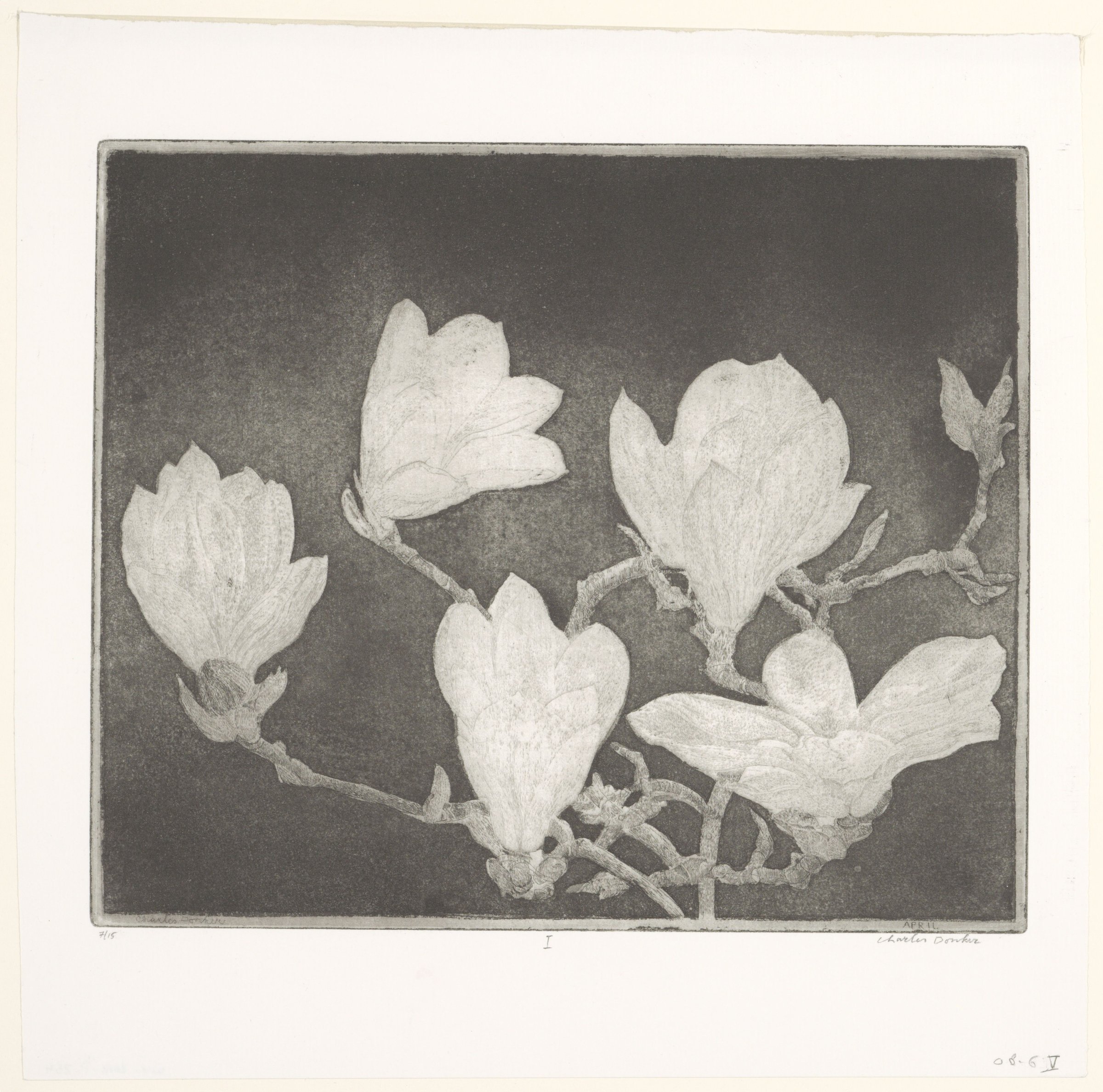 Home Online catalogues Art on Paper. Recent Acquisitions 28. Charles Donker Utrecht 1940 Magnolia I, c. 2007/8 As early as 1973, the Fondation Custodia began collecting the work of the Dutch draughtsman and printmaker Charles Donker.1 In an attempt to assemble a fine selection from his printed oeuvre, a group of 195 etchings was acquired over the last years, including Magnolia and Two Pine Cones. Crab in a Box, a gift from Peter Schatborn, was recently added to the collection. The three prints demonstrate Donker’s lifelong interest in nature. The young artist would often skip class, preferring to wander through the meadows around his hometown Utrecht with his sketchbook and drawing materials in hand. He continued to depict nature throughout his career, travelling not only within the Netherlands, but also to France, England, Spain, Poland, Peru and Israel. Animals, more often dead than alive, represent a special category in the oeuvre of the artist. They are usually depicted on a blank background with little to no suggestion of their natural habitat.2 Crab in a Box is an exception (see cat. no. 27). The entire copperplate was used up, resulting in a daunting image of a dead crab lying upside down on the bottom of its own coffin. The artist challenged himself with the foreshortened perspective and the complex structure of the crab’s exoskeleton, which is convincingly rendered with fine lines and subtle hatching in different tones of grey. The structure of things, as well as rhythm and abstraction, are also important in both Magnolia and Two Pine Cones, two relatively recent works by Donker. In the case of the former, the artist seems to have been particularly interested in rendering the robust, gnarly branches on the one hand and the delicate petals or budding leaves on the other. The vulnerability of the white leaves is further accentuated by the dark background, added by the artist with aquatint in the second state. Magnolia (see cat. no. 28) is the first in a series of three etchings of magnolia flowers, executed between 2007 and 2009.3 Inspired by the complex spiral pattern of the scales, Donker also repeatedly depicted pine cones.4 Two Pine Cones (see cat. no. 29) is one of his earliest prints with this subject. It shows the same pine cone, seen from above and from the side. According to the artist, drawing a pine cone is extremely difficult. “The pattern of how they the scales lie obliquely above each other. That is astonishingly difficult to get hold of. Then there is the problem of light and dark: all those scales, catching light, come from a dark core. Together they form a volume, a cone shape with its own gradient of light and darkness”.5 MR 1Paris, Fondation Custodia, inv. nos. 1973-P.17 (etching; 173 × 113 mm); 1973-P.18 (etching; 175 × 198 mm); and 1973-P.19 (etching, aquatint; 294 × 295 mm); see J.P. Filedt Kok, Charles Donker: grafiek 1960-2012, online catalogue RKDMonographs, last update 2016, nos. CD 69-14, CD 73-15 and CD 69-10; and http://charlesdonker.rkdmonographs.nl. 2Eddy de Jongh and Peter Schatborn, Charles Donker. Etser, Amsterdam 2002, p. 80. 3Filedt Kok 2016, op. cit (note 1), nos. CD 08-07 and CD 08-08; http://charlesdonker.rkdmonographs.nl. 4Ibid., nos. CD 10-10-CD 10-12, CD 12-1-CD 12-6; http://charlesdonker.rkdmonographs.nl. 5Quote from the artist in Gijsbert van der Wal, ‘Naar de natuur: een ontmoeting met Charles Donker’, in Jonathan Bikker et al. (eds.), “Gij zult niet feestbundelen”: 34 bijdragen voor Peter Hecht, Zwolle 2016, pp. 245-246.