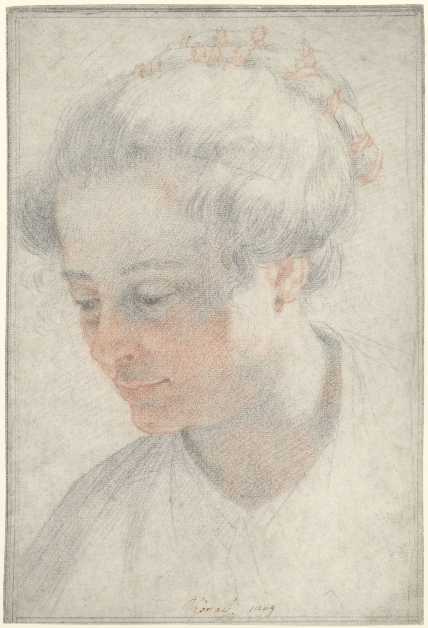 This drawing reveals Jacopo Vignali’s great sensitivity and meticulousness in the handling of light and shade. The artist combined red and black chalks in a particularly elegant manner: each medium is used to depict light as well as to add colour. The red chalk is reserved for the ribbon tied round the model’s hair and for the flesh tones. The rosy appearance of her face suggests the warm light of a fireplace or a candle. A dense, regular network of hatched lines allows Vignali to signal the darker areas; these disappear in the upper part of the hair and the back of the young woman’s neck indicating, thanks to the brightness of the paper, where the light falls.
