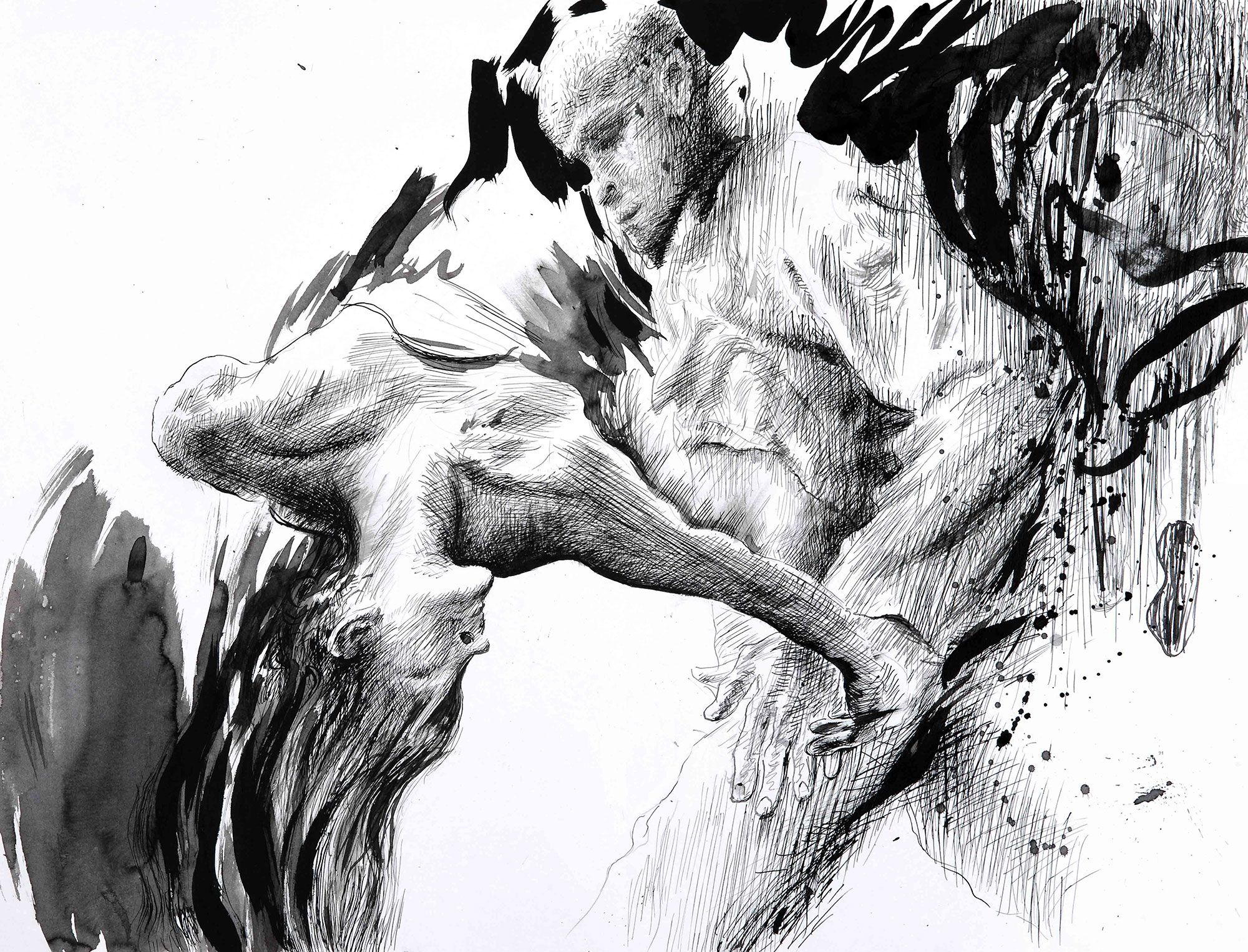 Works on paper by Ger Boosten Ink Circus from 21 March to 21 June 2015 In parallel with the Städel exhibition, a display of works on paper by the painter, draughtsman and printmaker Gèr Boosten opens on 21 March in the basement of the Hôtel Lévis-Mirepoix. Boosten was born in Maastricht in 1947, and lived there until 1996, when he and his family settled in France. For the last ten years he has lived and worked in a converted hangar in the village of Poilly-lez-Gien, 140 kilometres to the south of Paris. Boosten is a Dutch-born artist with, as he says himself, a French spirit, so an exhibition of his drawings in the Paris house of a Dutch drawing collection seems entirely appropriate. In staging shows like this, the Fondation Custodia turns the spotlight on contemporary artists who know their Classics. They are not nostalgic, but they do have an understanding of the history of drawing. They are artists who have no desire to break with tradition, but seek to continue it; artists for whom the work of the draughtsmen of the Renaissance, the Golden Age and Modernism is still a source of inspiration today. In the recent past the Rue de Lille has hosted, among others, Peter Vos’s Metamorphosis drawings, and, earlier this year, the works on paper by painter and sculptor Arie Schippers. For Gèr Boosten, the tradition in which he draws goes much further back than the Renaissance. He feels a kinship with prehistoric cave artists. ‘Not that I want to copy them, make prehistoric drawings myself. But in those wall drawings you see for the first time a monumentality, an artistic spiritual force, conveyed in such a way that we are still astounded by it in the twenty-first century. In my own drawings I want to build a magnetic field, too, a tension between the black and the white. An open structure, comparable to the structure of the stars in the night sky. When I go outside in the evening and stand on the plateau near my house and look up at the stars, I understand very clearly what prehistoric man felt. They tried to take what they saw up above and place it down here. Stones with a hole in them have been found in France: this was the lens they looked through. In fact this hole is the rectangle of a drawing. The frame. Two hundred and fifty thousand years ago we were already looking for a frame, and we are still exploring our place in the universe within frameworks like this. I believe that every drawing should be a reflection of the universe.’ Tango, 06/01/2014 Indian ink, 50 × 65 cm Boosten sets the bar high. And not just formally, with that tension between black and white, but with the subjects of his drawings. As a toddler in his father’s studio he was already drawing what he imagined when he heard news reports about the disastrous floods in Zeeland and the Korean War. Around 1970 he was an exchange student in Yugoslavia, where he hung around with gypsies, alcoholics and prostitutes. ‘Looking back, I can see that that time in Belgrade was the basis of the whole of the rest of my life. It was a harsh world, and I’ve captured that in my work: the mess, the mud, the poverty, the sharp definition. It lay there for the taking and I thought it was fantastic. Life and death were very close.’ On his return to the Netherlands Boosten graduated with drawings and paintings of crowds of ordinary people, crammed together in buses and trams or smoking and drinking at large tables. He drew people pushing and shoving, mini rebellions and murders. The setting is often stage-like: the figures stand and lie on the wooden planks of a shed floor or on a piece of flat land stretching in perspective to a high horizon. Beds, tables and stoves look like pieces of scenery, curtains and washing lines like stage wings. After taking his finals at the Jan van Eyck Academy in Maastricht, Boosten stayed on and took a course in set design. His teacher, the painter, printmaker and set designer Nicolaas Wijnberg (1918-2006), soon became a good friend. In the nineteen-seventies Boosten designed sets for the Groot Limburgs Toneel and the Amsterdam theatre group Globe. His sets for Hugo Claus’s plays Suiker (Sugar) and Een bruid in de morgen (A Bride in the Morning) have a great deal in common with his ‘Yugoslavian’ etchings and drawings. Ger Luijten of the Fondation Custodia came across Gèr Boosten’s work a decade or so ago, when he was the keeper of the Rijksprentenkabinet in the Rijksmuseum in Amsterdam. The first etchings and drawings by Boosten came into the collection there as part of the Nicolaas Wijnberg bequest. More works were added to the group later in consultation with Boosten. Last year Boosten gave a series of etchings to the Fondation Custodia. The exhibition at the Fondation includes some of these etchings and other early prints, a selection from Boosten’s sketchbooks and a series of large pen and ink drawings he made recently. In these new drawings, men and women are struck by flying chairs and shoes or by stones from space. They are attacked by dogs and wolves or by one another. People are injured, people are killed. Boosten’s work is as theatrical as ever and still deals with la condition humaine. ‘It is very existential,’ he says himself. ‘It is to do with the plays of Beckett and Ionesco, and Pasolini’s films. My work is not an indictment, absolutely not. I don’t make these etchings to say just look at what a mess it all is. No, it’s a kind of serenity, it’s behold mankind. Ecce homo. We could all end up in the gutter. You only have to go through a divorce. First you lose your house, then you sleep in your car, and the next thing you know you’re in the gutter. It’s only too possible. I can put myself in the position of people who commit a crime or are supposedly mad. I don’t think I can do anything about the evils in the world, my reach is too short, but I’m an artist and I can do something with that. Like Pasolini or Lars van Trier, like Rembrandt, Grünewald 
