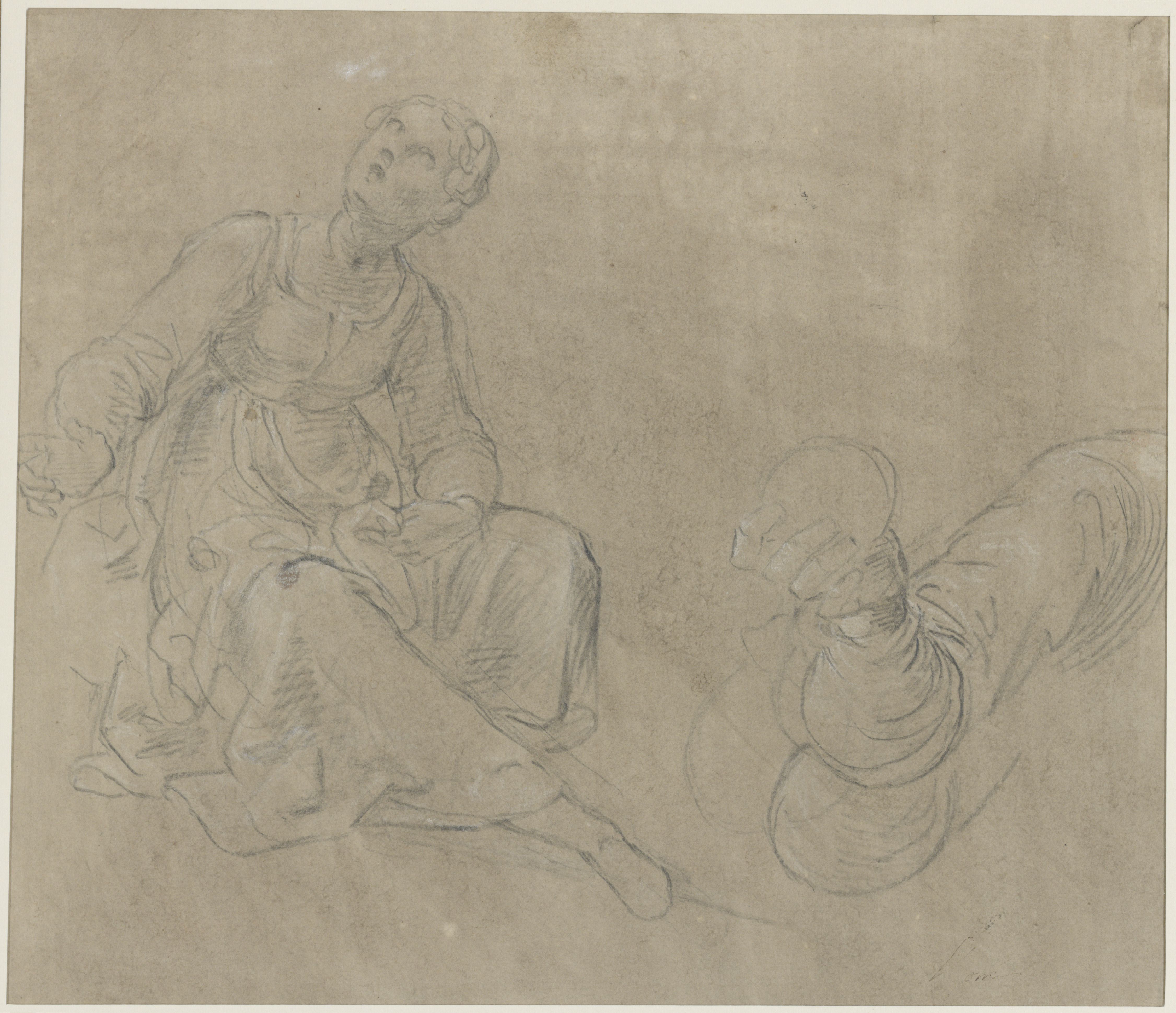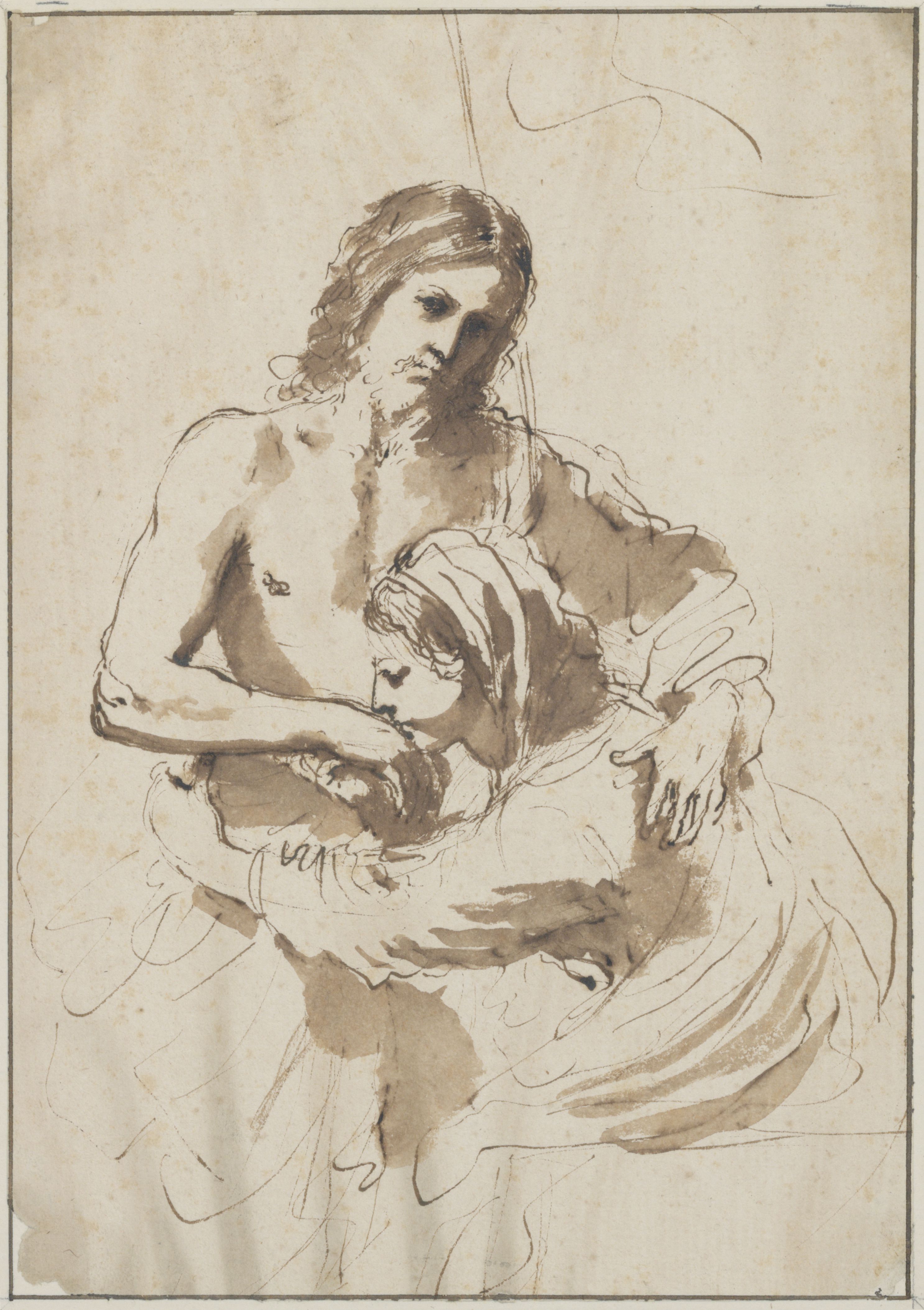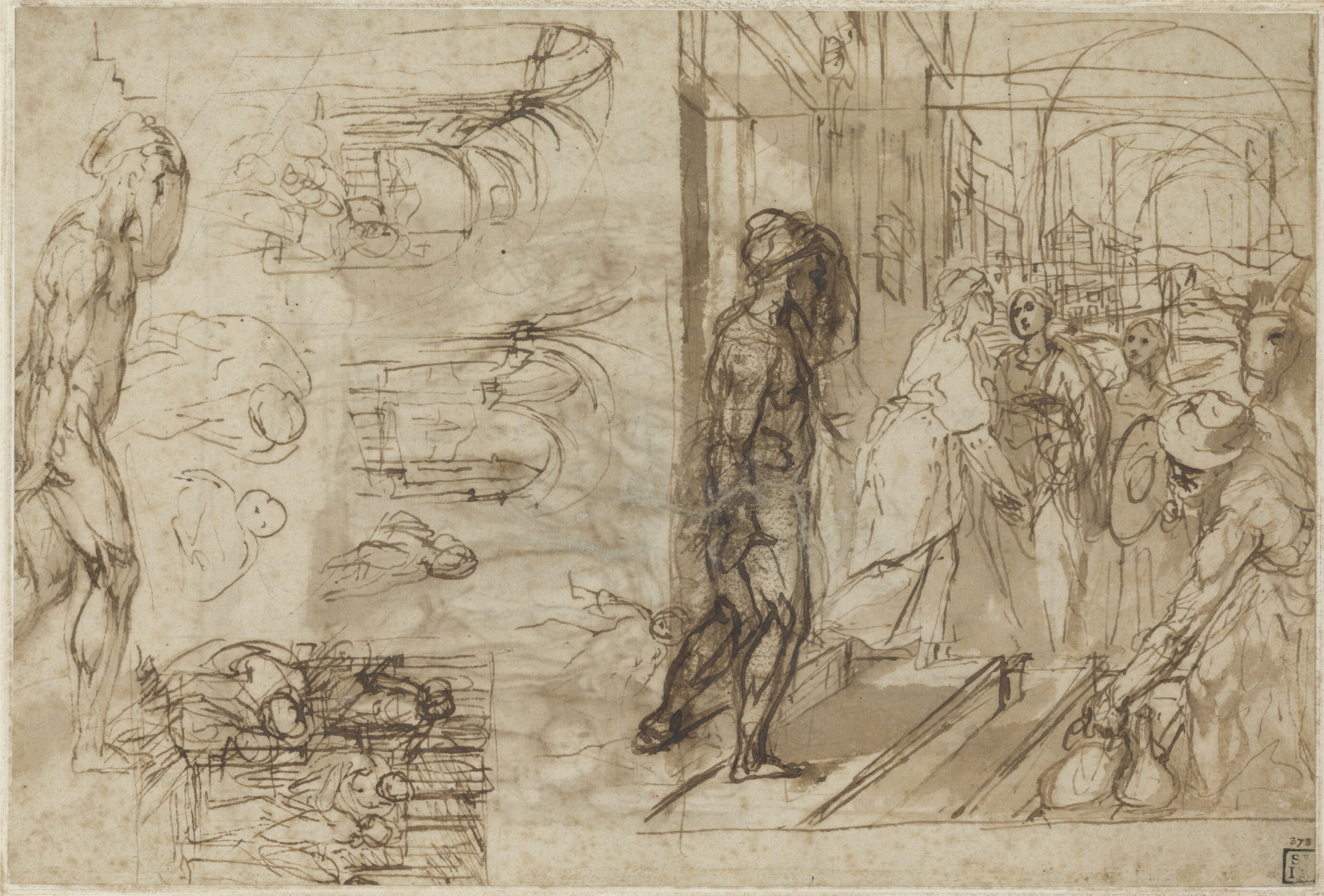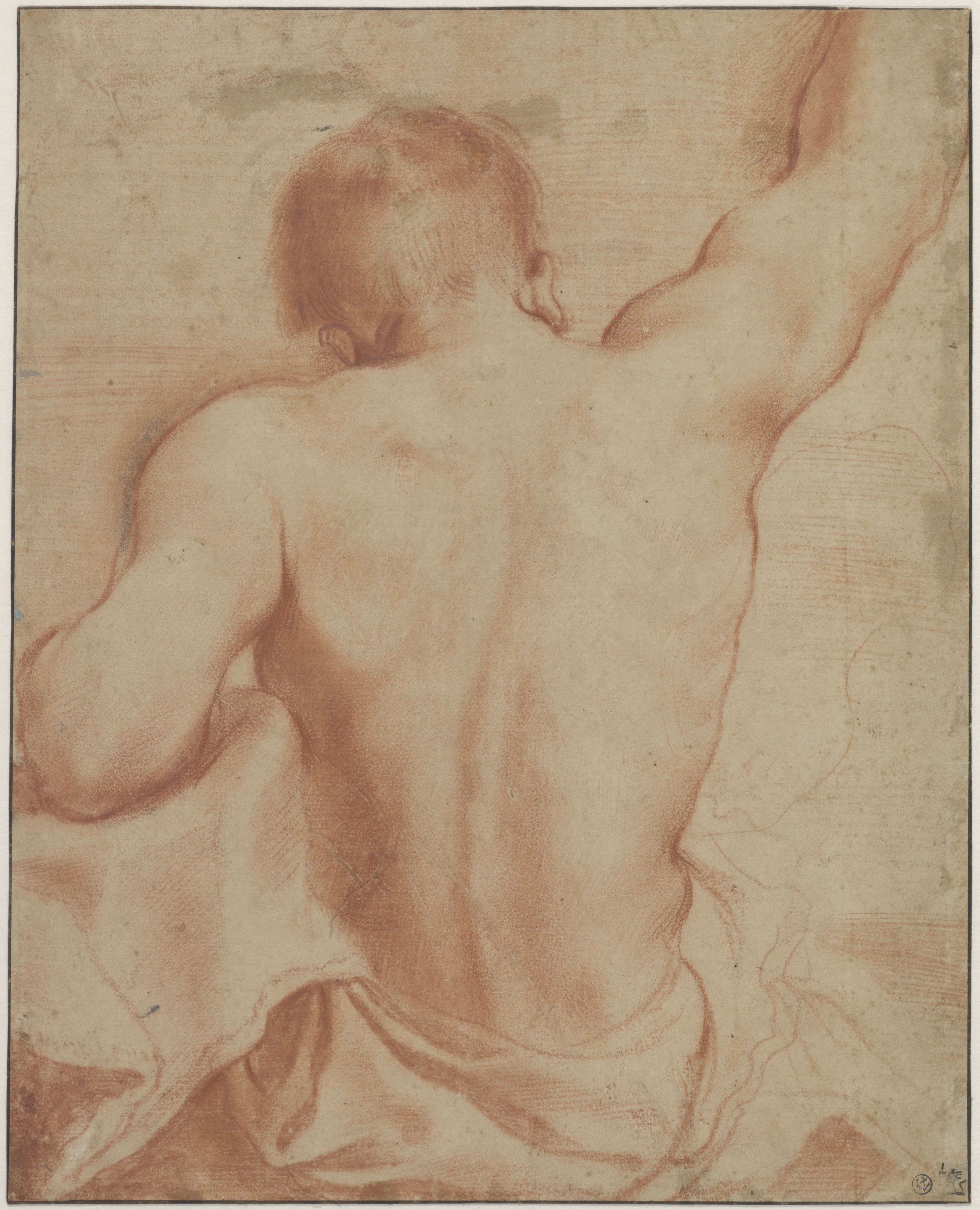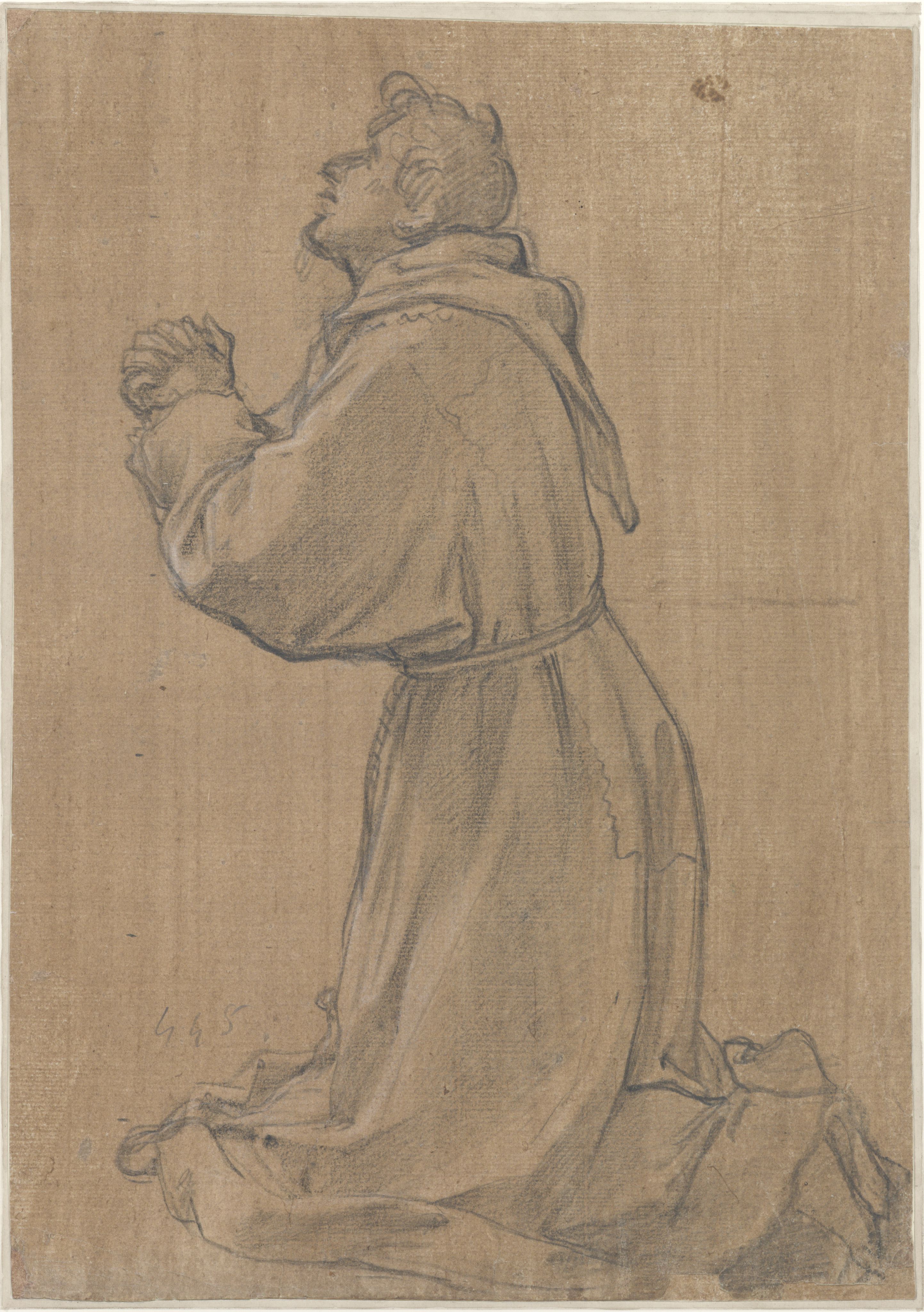 Accueil Catalogues en ligne Studi & Schizzi Introduction C’est à Florence, au XVe siècle, que les premiers traités artistiques virent le jour. Dès le siècle suivant, les théoriciens tels que Giorgio Vasari (1511 – 1574) affirmèrent la primauté du dessin, essentiel dans le processus de création, autant que dans la formation des artistes. En italien, disegno désignait aussi bien le projet intellectuel d’une œuvre (dessein) que son exécution formelle (dessin). Federico Zuccari (v. 1540 – 1609) distinguait ainsi le disegno interno, image mentale, et le disegno esterno, image matérialisée. La représentation de la figure humaine fut une préoccupation majeure de la Renaissance et fit l’objet d’un intérêt constant dans l’art italien au cours des siècles. Cherchant à atteindre une narration idéale dans une image qui, par nature, est immobile, les peintres s’attachèrent à représenter des personnages dans des proportions et des attitudes éloquentes. Transcription la plus immédiate et spontanée de l’inspiration des artistes, le dessin leur permettait d’explorer différentes solutions formelles. Du premier geste des esquisses – schizzi – rapidement tracées sur le papier, aux études – studi – plus soignées, les dessins sont de précieux témoignages du cheminement de l’esprit de l’artiste. En 1962, Frits Lugt présentait l’acte de dessiner comme une « confession involontaire », par laquelle nous surprenons le peintre dans ses réflexions. « On partage ses pensées, on se heurte avec lui aux difficultés, on admire la manière dont il parvient à les vaincre. » Comment définir la position des modèles et les liens qui les unissent ? Comment disposer ces figures dans un espace correspondant à celui de l’œuvre future ? Comment traduire les effets d’ombre et de lumière sur les corps ? Grâce aux œuvres issues des collections de la Fondation Custodia, l’exposition invite à observer les dessins, y déceler les indices révélateurs des recherches et des intentions des maîtres italiens. I. Étudier la figure La figure humaine a toujours occupé une position privilégiée dans l’esprit des artistes. À la Renaissance, quand l’Humanisme plaça l’homme au centre du monde, sa représentation devint un enjeu majeur de la création artistique. Les artistes cherchèrent à comprendre la façon dont un corps se meut et agit, pour donner aux personnages de leurs œuvres un caractère plus réaliste et éloquent. Les traités et les académies artistiques qui se développaient en Italie au XVIe siècle prônèrent l’étude des figures d’après nature, c’est-à-dire basée sur l’observation d’un modèle vivant, qui devint une pratique centrale au sein des ateliers.Dessiner chaque figure de manière particulière constituait aussi bien l’une des étapes préliminaires à la réalisation d’une peinture qu’un exercice pour entraîner l’œil et la main. Les pentimenti (repentirs), le dédoublement des lignes, les reprises et les variations de tout ou partie d’un corps, juxtaposées sur un même support ou répétées d’une feuille à l’autre, sont autant de signes montrant le dessinateur qui s’évertue à perfectionner l’anatomie et à expérimenter l’expressivité d’une attitude ou d’un mouvement. Schizzo (i) : dicono i Pittori quei leggerissimi tocchi di penna o matita, con i quali accennano i lor concetti senza dar perfezzione alle parti ; il che dicono schizzare Esquisse (s) : sont ainsi appelés par les peintres les très légers tracés de plumes ou de crayons avec lesquels ils évoquent leurs concepts sans en perfectionner les parties ; ce qu’ils appellent esquisser Studio (i) : termine de’ Pittori, e Scultori, col quale denominano tutti i disegni o modelli, cavati dal naturale, co’ quali si preparano a far le loro opere ; poichè mediante questi, che essi chiamano studi, vengono a determinare, e perfezionare l’Idea di quella cosa, che vogliono, o con pennello, o con scarpello, rappresentare in pittura o scultura Étude (s) : terme des peintres et des sculpteurs par lequel ils désignent tous les dessins ou modèles tirés de la nature, avec lesquels ils se préparent à faire leurs œuvres ; car par l’intermédiaire de ce qu’ils appellent études, ils parviennent à déterminer et à perfectionner l’Idée de ce qu’ils veulent, avec le pinceau ou le ciseau, représenter en peinture ou en sculpture Filippo Baldinucci, Vocabolario Toscano dell’Arte del Disegno, Florence, 1681 1. Federico Barocci Tête d’un homme barbu, inclinée vers la droite et étude de sa main, années 1590 2. Filippino Lippi Trois études d’un jeune homme portant un manteau 3. Mariotto Albertinelli Huit études d’enfants nus 4. Giovanni Francesco Barbieri, dit Guercino Cinq études pour Marie-Madeleine, vers 1620 5. Andrea del Sarto Études pour la tête, le torse et le bras droit d’un garçon, vers 1526 6. Federico Barocci Deux études d’un homme agenouillé, vers 1605-1608 7. Federico Barocci Deux études de femmes et une étude de draperie, entre 1575 et 1579 8. Baccio Bandinelli Portrait d’une jeune femme le regard baissé. Verso : Portrait du même modèle, regardant derrière son épaule 9. Federico Zuccari Deux études de tête : Vincenzo Borghini, vers 1575-1579 10. Giovanni Francesco Barbieri, dit Guercino Deux études pour la tête de la Vierge, vers 1654 11. Anonyme italien fin, du XVIe siecle Allégorie de la Charité (?) 12. Francesco Salviati Figure féminine drapée, en pied : Salomé, avant 1541 13. Giuseppe Cesari, dit il Cavalier d’Arpino Sibylle persique, vers 1593-1595 14. Ludovico Carracci Un moine assis avec un livre 15. Jacopo Chimenti, dit Jacopo da Empoli Un moine agenouillé en prière : saint François, vers 1590 16. Francesco Curradi Un homme barbu, assis, tourné vers la gauche 17. Andrea del Sarto Étude d’un enfant dans les bras de sa mère, entre 1524 et 1526 18.