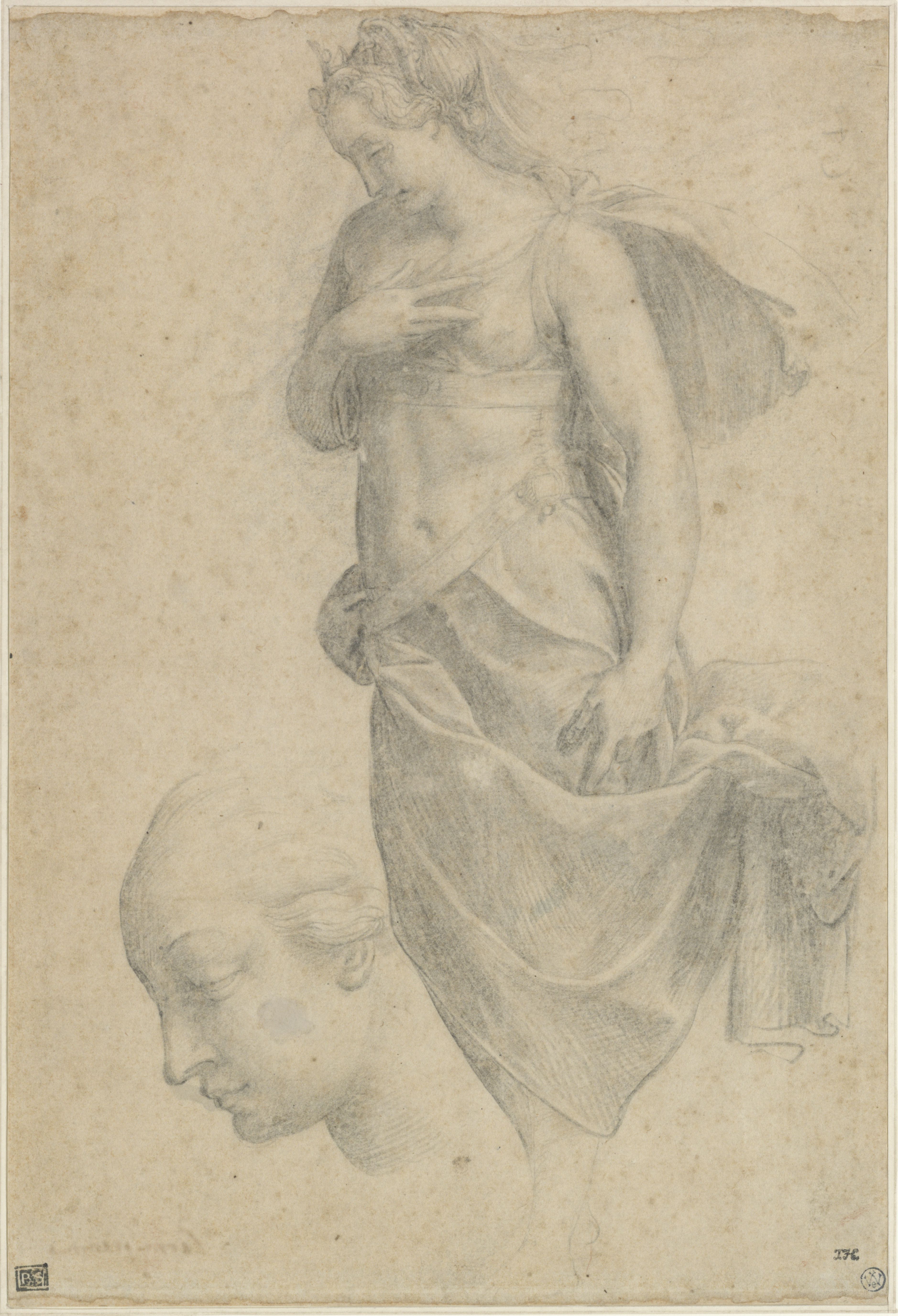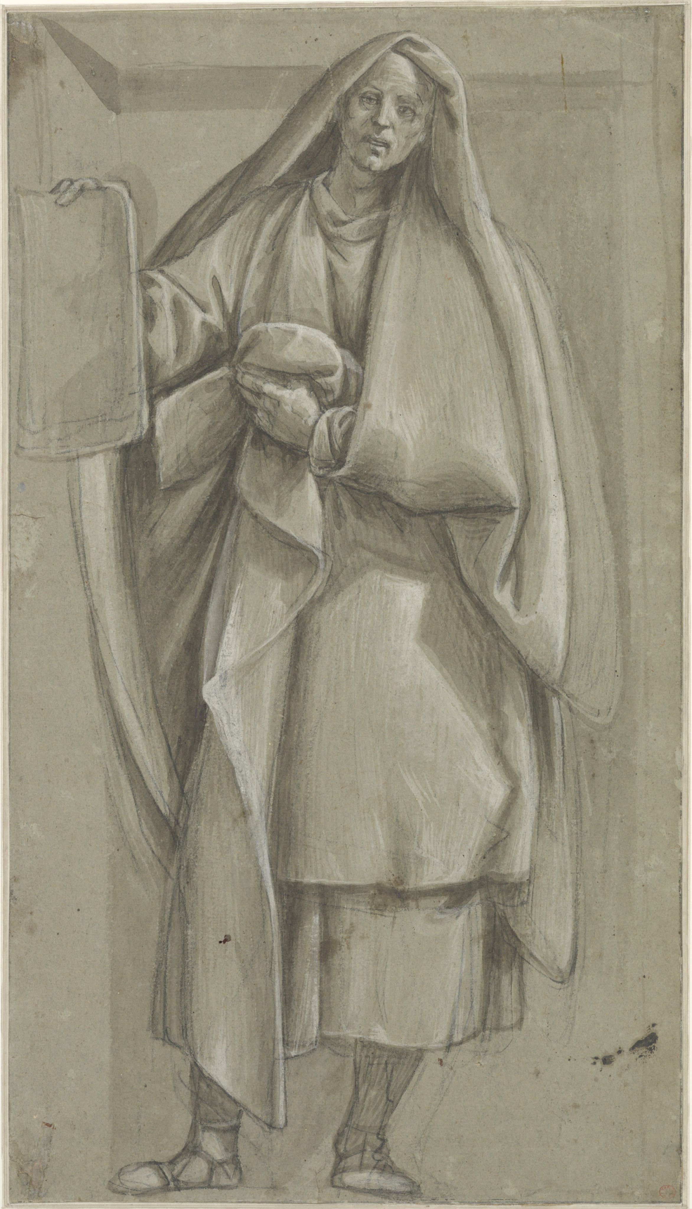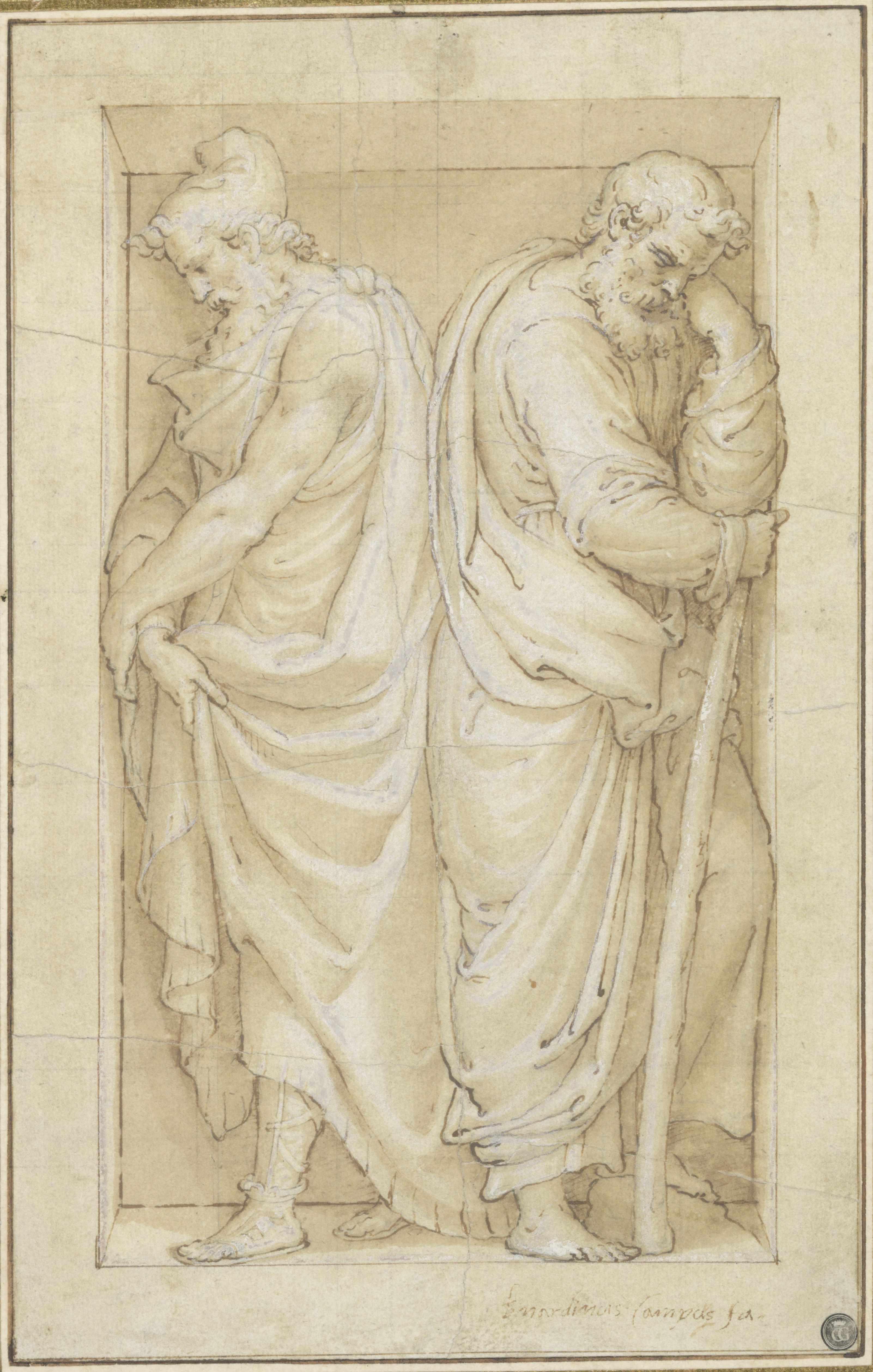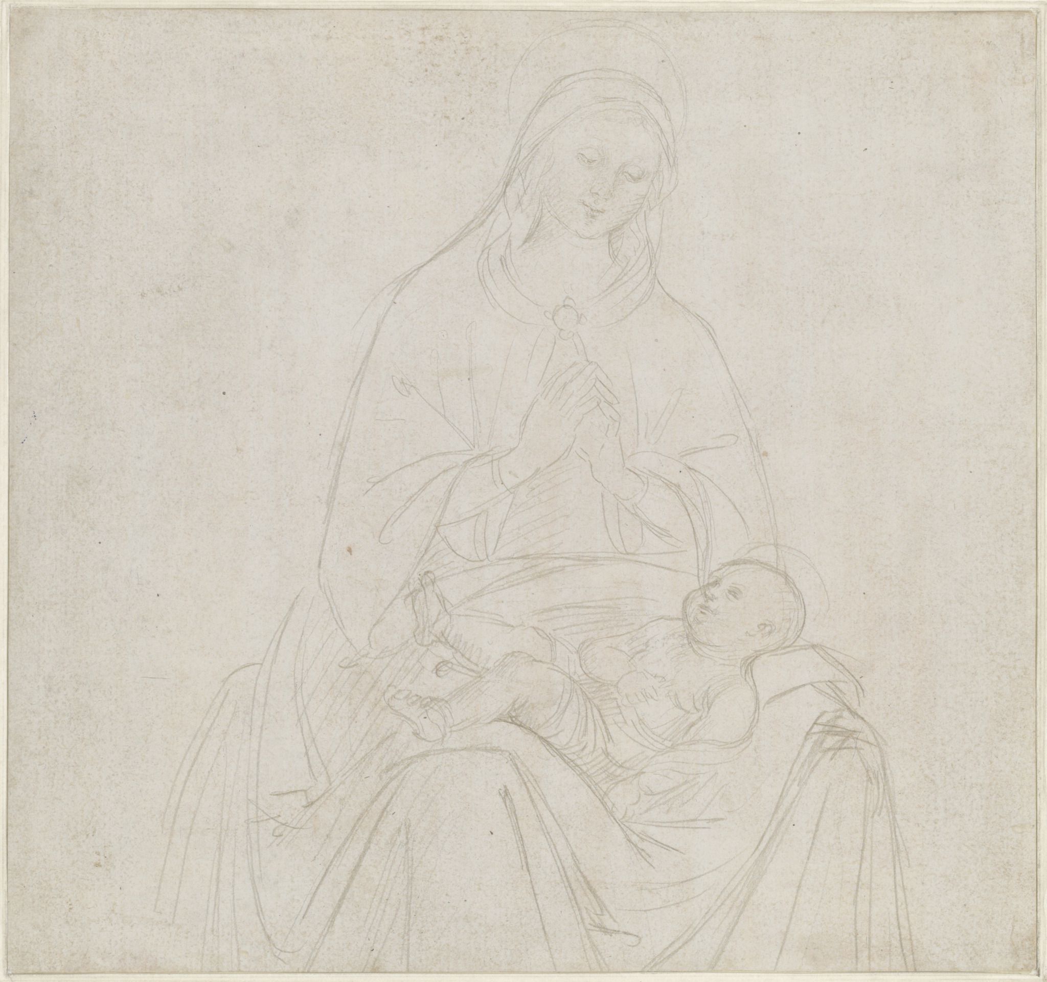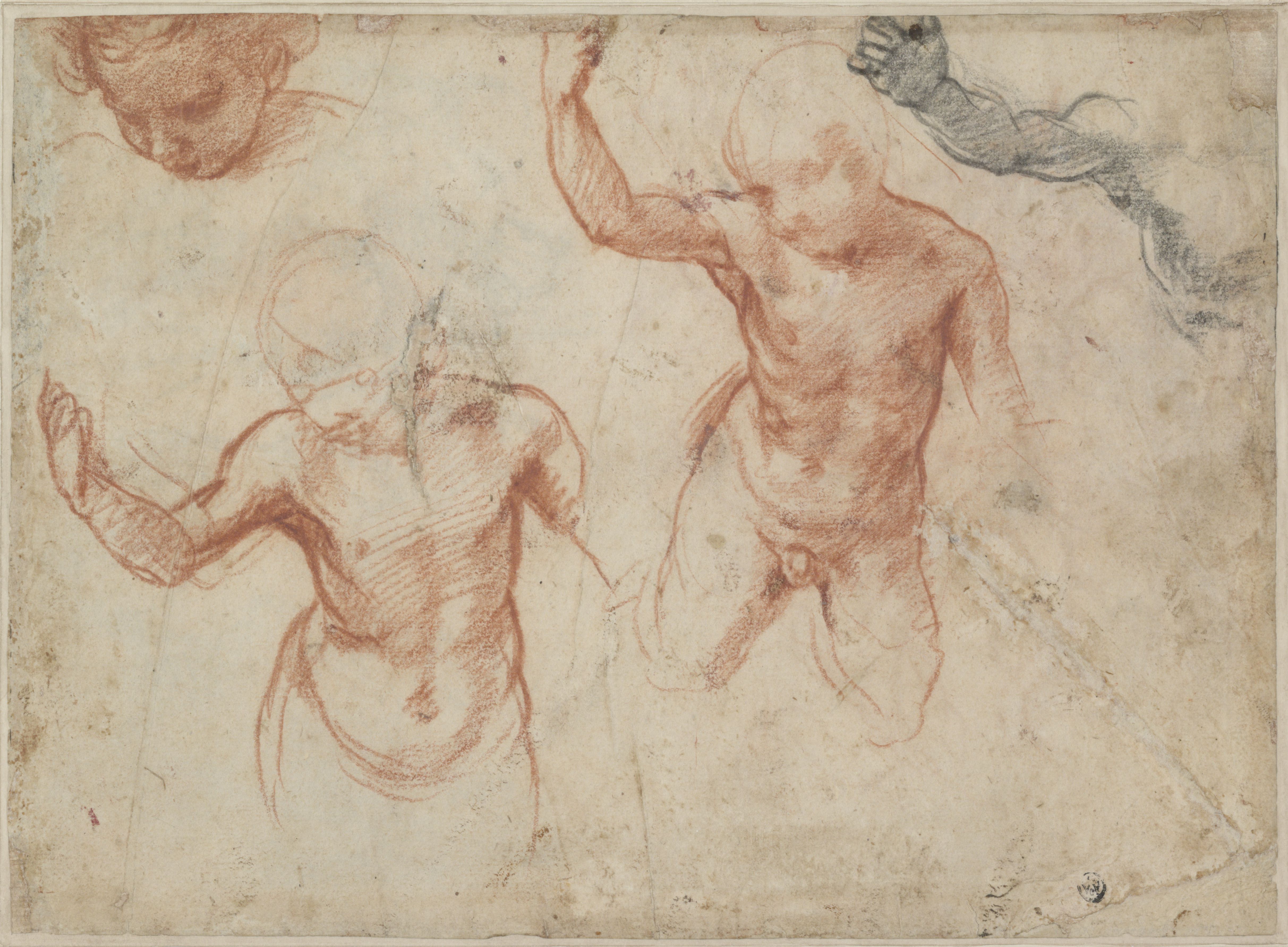 Accueil Catalogues en ligne Studi & Schizzi Introduction C’est à Florence, au XVe siècle, que les premiers traités artistiques virent le jour. Dès le siècle suivant, les théoriciens tels que Giorgio Vasari (1511 – 1574) affirmèrent la primauté du dessin, essentiel dans le processus de création, autant que dans la formation des artistes. En italien, disegno désignait aussi bien le projet intellectuel d’une œuvre (dessein) que son exécution formelle (dessin). Federico Zuccari (v. 1540 – 1609) distinguait ainsi le disegno interno, image mentale, et le disegno esterno, image matérialisée. La représentation de la figure humaine fut une préoccupation majeure de la Renaissance et fit l’objet d’un intérêt constant dans l’art italien au cours des siècles. Cherchant à atteindre une narration idéale dans une image qui, par nature, est immobile, les peintres s’attachèrent à représenter des personnages dans des proportions et des attitudes éloquentes. Transcription la plus immédiate et spontanée de l’inspiration des artistes, le dessin leur permettait d’explorer différentes solutions formelles. Du premier geste des esquisses – schizzi – rapidement tracées sur le papier, aux études – studi – plus soignées, les dessins sont de précieux témoignages du cheminement de l’esprit de l’artiste. En 1962, Frits Lugt présentait l’acte de dessiner comme une « confession involontaire », par laquelle nous surprenons le peintre dans ses réflexions. « On partage ses pensées, on se heurte avec lui aux difficultés, on admire la manière dont il parvient à les vaincre. » Comment définir la position des modèles et les liens qui les unissent ? Comment disposer ces figures dans un espace correspondant à celui de l’œuvre future ? Comment traduire les effets d’ombre et de lumière sur les corps ? Grâce aux œuvres issues des collections de la Fondation Custodia, l’exposition invite à observer les dessins, y déceler les indices révélateurs des recherches et des intentions des maîtres italiens. I. Étudier la figure La figure humaine a toujours occupé une position privilégiée dans l’esprit des artistes. À la Renaissance, quand l’Humanisme plaça l’homme au centre du monde, sa représentation devint un enjeu majeur de la création artistique. Les artistes cherchèrent à comprendre la façon dont un corps se meut et agit, pour donner aux personnages de leurs œuvres un caractère plus réaliste et éloquent. Les traités et les académies artistiques qui se développaient en Italie au XVIe siècle prônèrent l’étude des figures d’après nature, c’est-à-dire basée sur l’observation d’un modèle vivant, qui devint une pratique centrale au sein des ateliers.Dessiner chaque figure de manière particulière constituait aussi bien l’une des étapes préliminaires à la réalisation d’une peinture qu’un exercice pour entraîner l’œil et la main. Les pentimenti (repentirs), le dédoublement des lignes, les reprises et les variations de tout ou partie d’un corps, juxtaposées sur un même support ou répétées d’une feuille à l’autre, sont autant de signes montrant le dessinateur qui s’évertue à perfectionner l’anatomie et à expérimenter l’expressivité d’une attitude ou d’un mouvement. Schizzo (i) : dicono i Pittori quei leggerissimi tocchi di penna o matita, con i quali accennano i lor concetti senza dar perfezzione alle parti ; il che dicono schizzare Esquisse (s) : sont ainsi appelés par les peintres les très légers tracés de plumes ou de crayons avec lesquels ils évoquent leurs concepts sans en perfectionner les parties ; ce qu’ils appellent esquisser Studio (i) : termine de’ Pittori, e Scultori, col quale denominano tutti i disegni o modelli, cavati dal naturale, co’ quali si preparano a far le loro opere ; poichè mediante questi, che essi chiamano studi, vengono a determinare, e perfezionare l’Idea di quella cosa, che vogliono, o con pennello, o con scarpello, rappresentare in pittura o scultura Étude (s) : terme des peintres et des sculpteurs par lequel ils désignent tous les dessins ou modèles tirés de la nature, avec lesquels ils se préparent à faire leurs œuvres ; car par l’intermédiaire de ce qu’ils appellent études, ils parviennent à déterminer et à perfectionner l’Idée de ce qu’ils veulent, avec le pinceau ou le ciseau, représenter en peinture ou en sculpture Filippo Baldinucci, Vocabolario Toscano dell’Arte del Disegno, Florence, 1681 1. Federico Barocci Tête d’un homme barbu, inclinée vers la droite et étude de sa main, années 1590 2. Filippino Lippi Trois études d’un jeune homme portant un manteau 3. Mariotto Albertinelli Huit études d’enfants nus 4. Giovanni Francesco Barbieri, dit Guercino Cinq études pour Marie-Madeleine, vers 1620 5. Andrea del Sarto Études pour la tête, le torse et le bras droit d’un garçon, vers 1526 6. Federico Barocci Deux études d’un homme agenouillé, vers 1605-1608 7. Federico Barocci Deux études de femmes et une étude de draperie, entre 1575 et 1579 8. Baccio Bandinelli Portrait d’une jeune femme le regard baissé. Verso : Portrait du même modèle, regardant derrière son épaule 9. Federico Zuccari Deux études de tête : Vincenzo Borghini, vers 1575-1579 10. Giovanni Francesco Barbieri, dit Guercino Deux études pour la tête de la Vierge, vers 1654 11. Anonyme italien fin, du XVIe siecle Allégorie de la Charité (?) 12. Francesco Salviati Figure féminine drapée, en pied : Salomé, avant 1541 13. Giuseppe Cesari, dit il Cavalier d’Arpino Sibylle persique, vers 1593-1595 14. Ludovico Carracci Un moine assis avec un livre 15. Jacopo Chimenti, dit Jacopo da Empoli Un moine agenouillé en prière : saint François, vers 1590 16. Francesco Curradi Un homme barbu, assis, tourné vers la gauche 17. Andrea del Sarto Étude d’un enfant dans les bras de sa mère, entre 1524 et 1526 18.