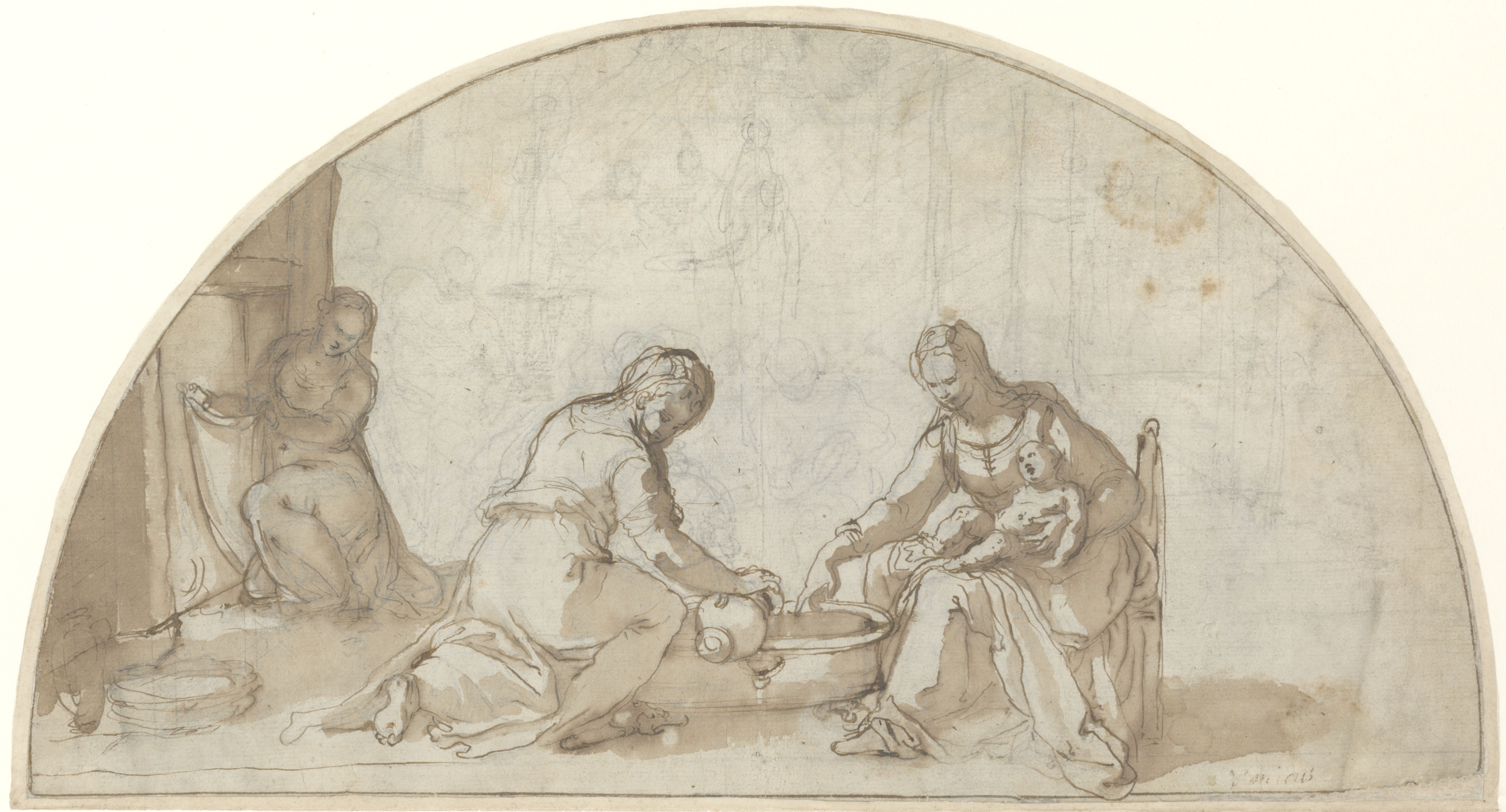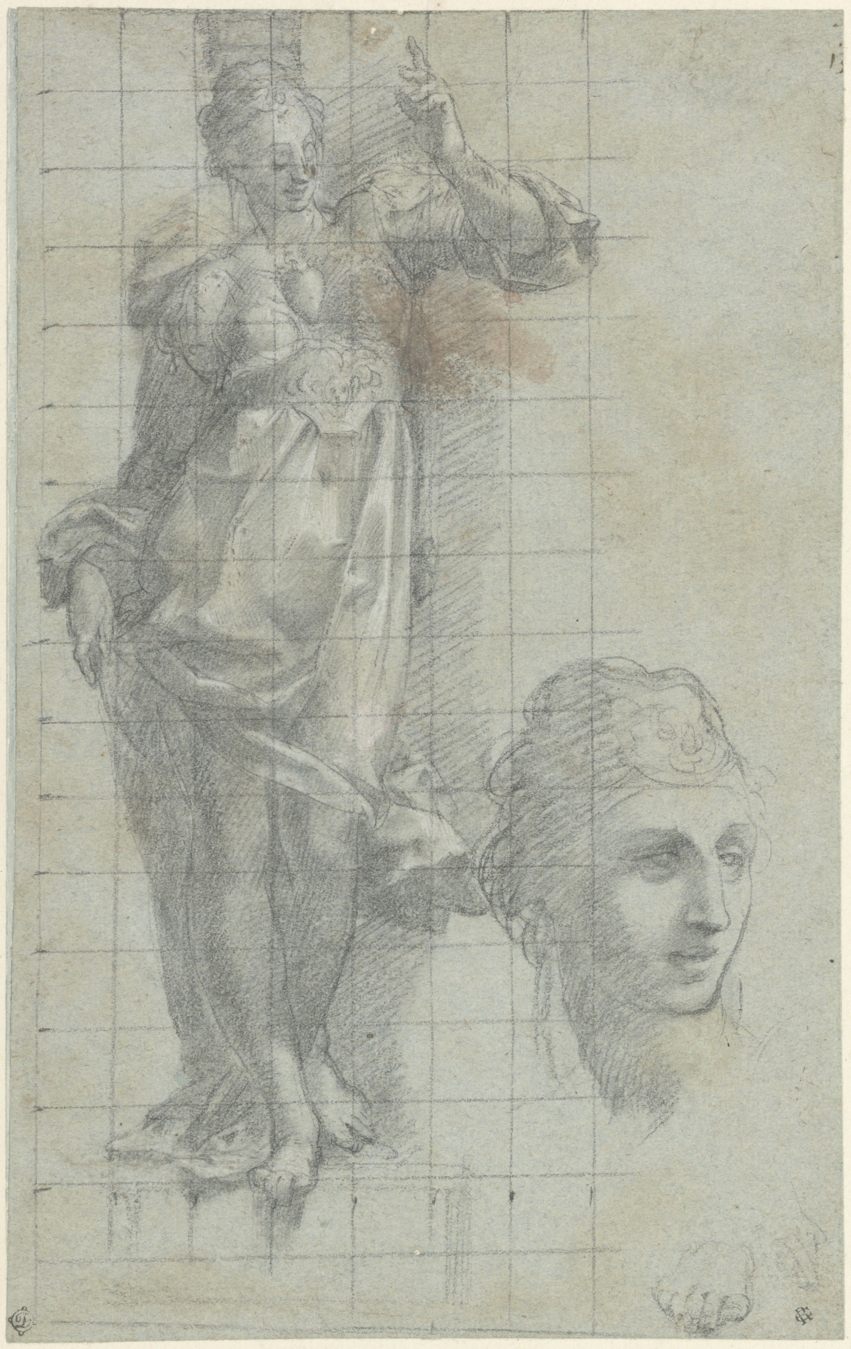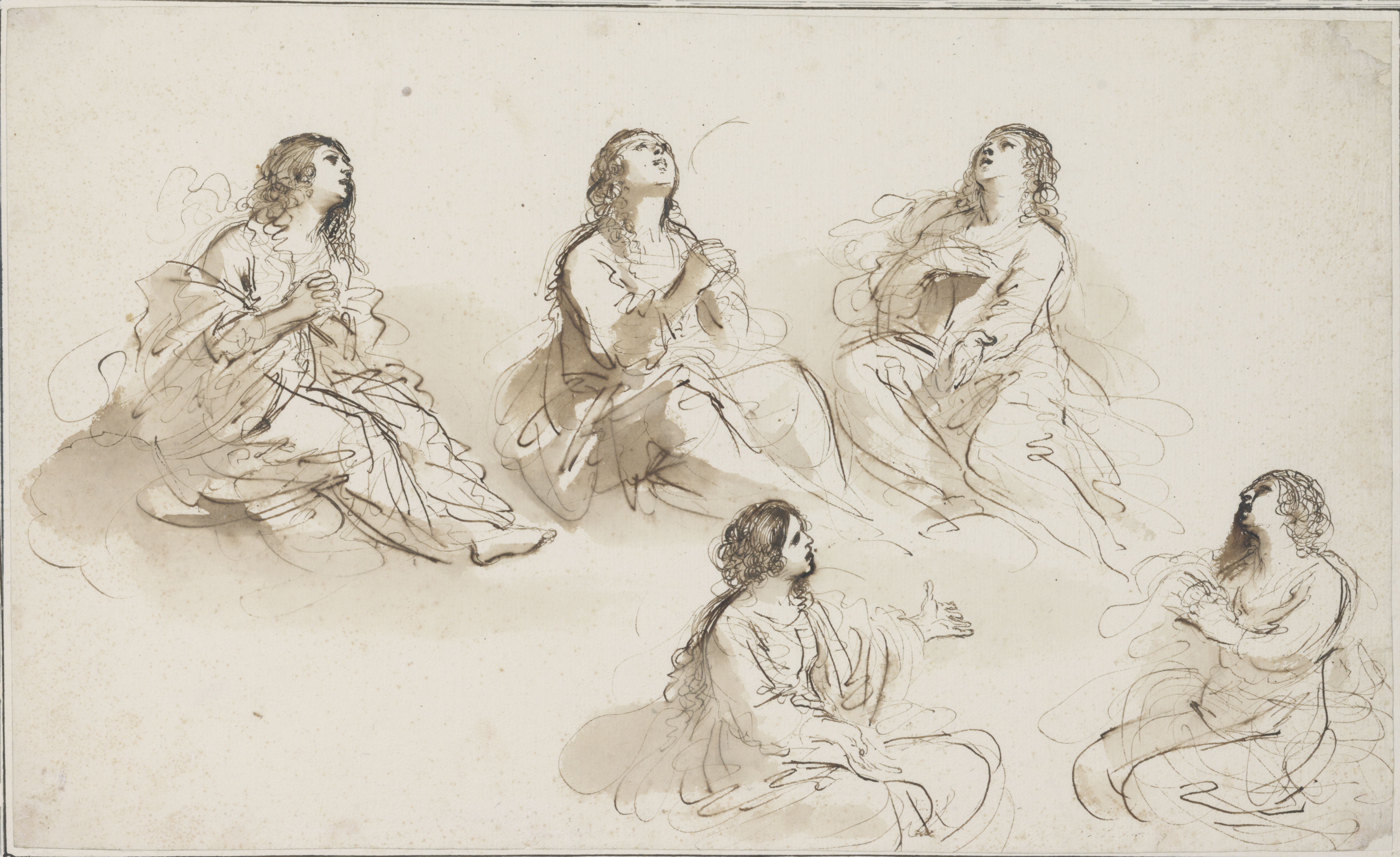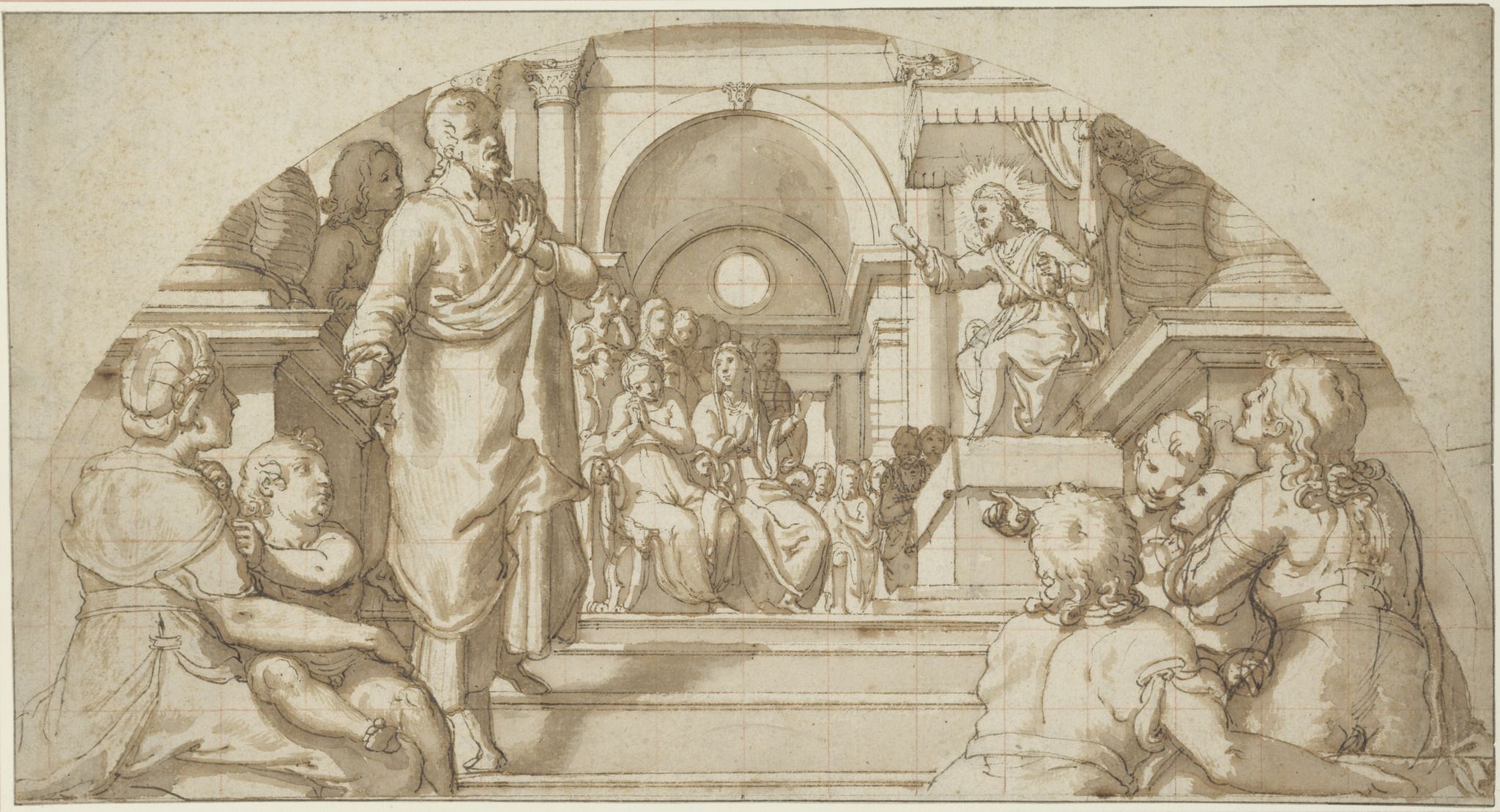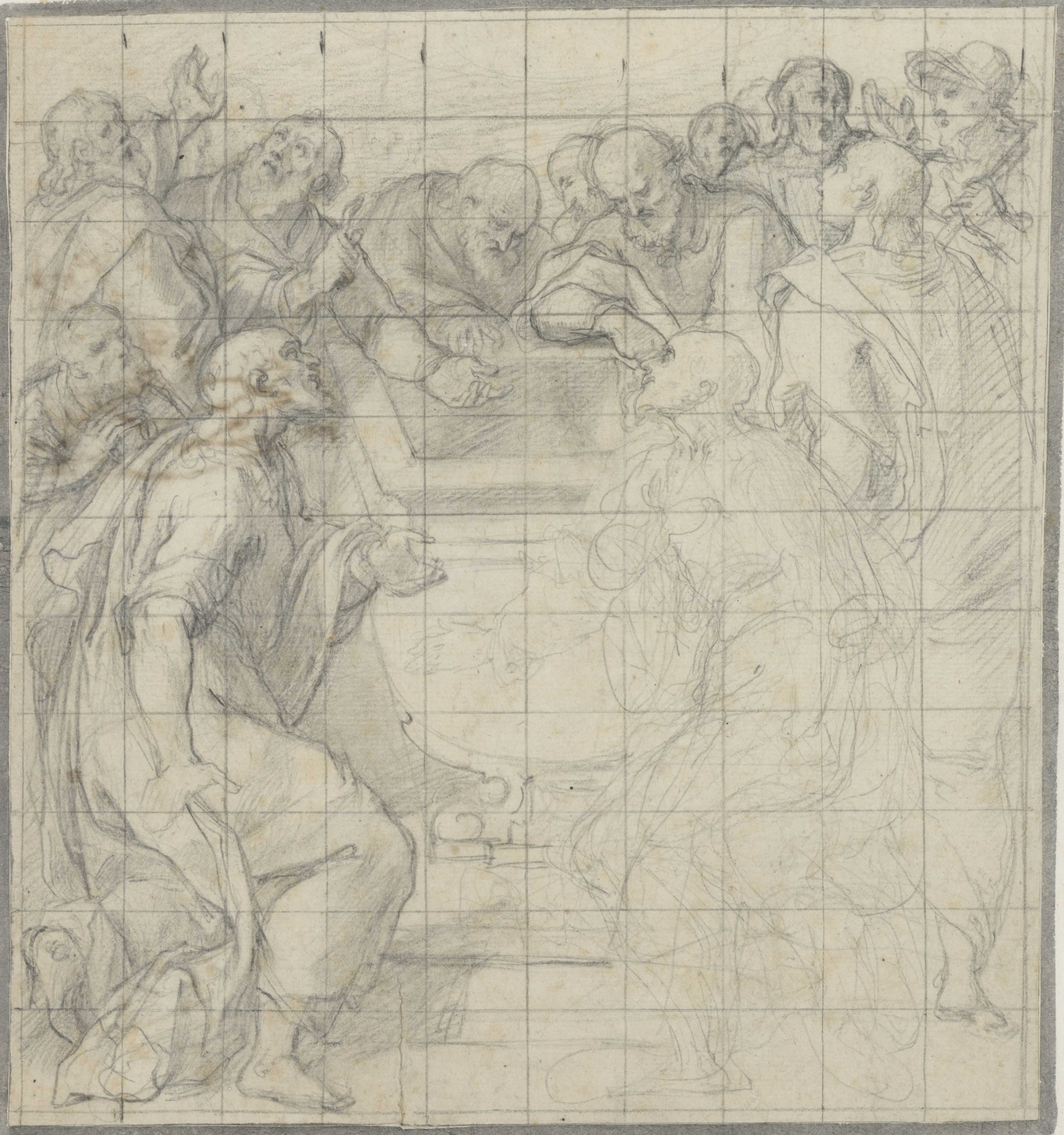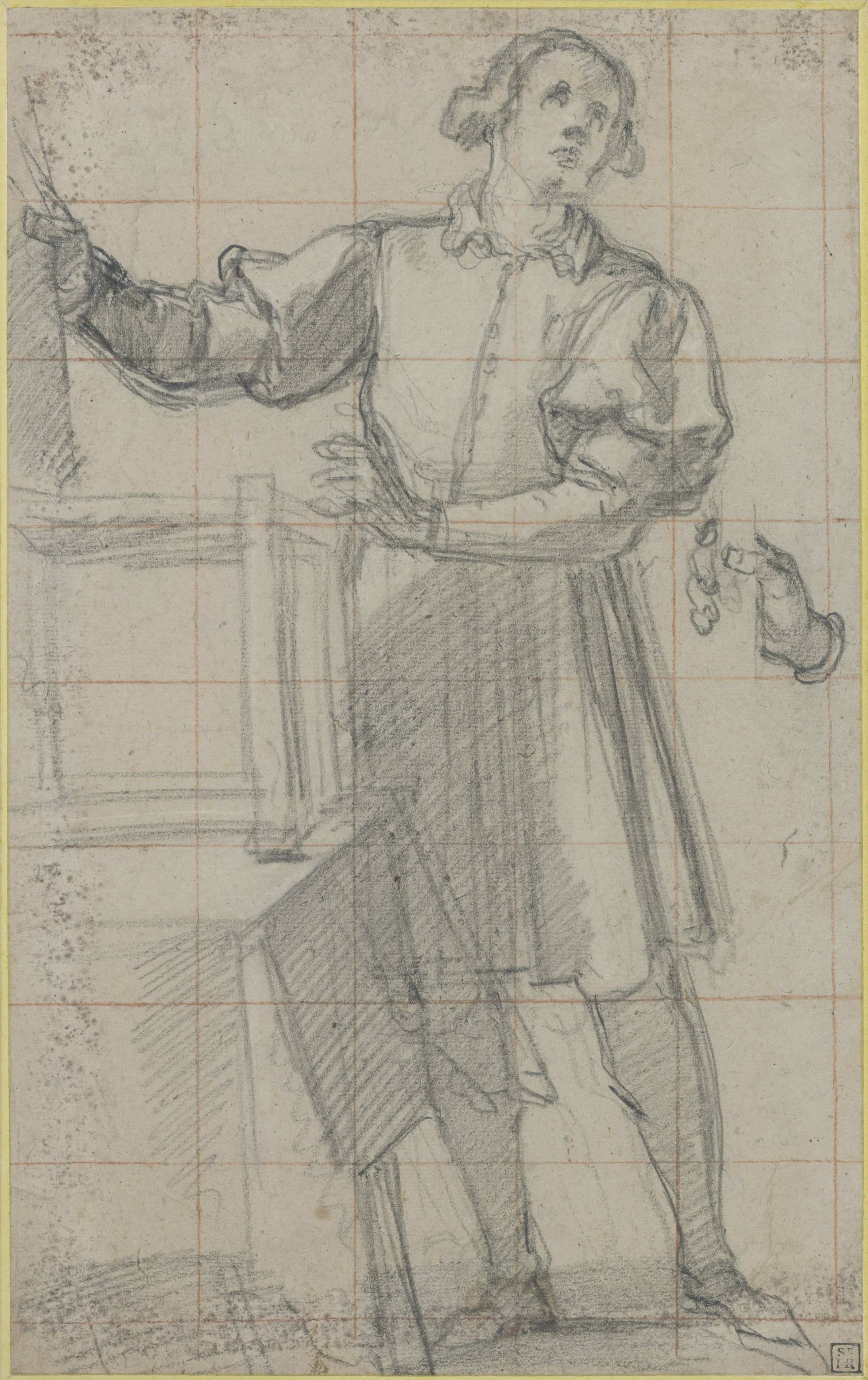 Accueil Catalogues en ligne Studi & Schizzi Introduction C’est à Florence, au XVe siècle, que les premiers traités artistiques virent le jour. Dès le siècle suivant, les théoriciens tels que Giorgio Vasari (1511 – 1574) affirmèrent la primauté du dessin, essentiel dans le processus de création, autant que dans la formation des artistes. En italien, disegno désignait aussi bien le projet intellectuel d’une œuvre (dessein) que son exécution formelle (dessin). Federico Zuccari (v. 1540 – 1609) distinguait ainsi le disegno interno, image mentale, et le disegno esterno, image matérialisée. La représentation de la figure humaine fut une préoccupation majeure de la Renaissance et fit l’objet d’un intérêt constant dans l’art italien au cours des siècles. Cherchant à atteindre une narration idéale dans une image qui, par nature, est immobile, les peintres s’attachèrent à représenter des personnages dans des proportions et des attitudes éloquentes. Transcription la plus immédiate et spontanée de l’inspiration des artistes, le dessin leur permettait d’explorer différentes solutions formelles. Du premier geste des esquisses – schizzi – rapidement tracées sur le papier, aux études – studi – plus soignées, les dessins sont de précieux témoignages du cheminement de l’esprit de l’artiste. En 1962, Frits Lugt présentait l’acte de dessiner comme une « confession involontaire », par laquelle nous surprenons le peintre dans ses réflexions. « On partage ses pensées, on se heurte avec lui aux difficultés, on admire la manière dont il parvient à les vaincre. » Comment définir la position des modèles et les liens qui les unissent ? Comment disposer ces figures dans un espace correspondant à celui de l’œuvre future ? Comment traduire les effets d’ombre et de lumière sur les corps ? Grâce aux œuvres issues des collections de la Fondation Custodia, l’exposition invite à observer les dessins, y déceler les indices révélateurs des recherches et des intentions des maîtres italiens. I. Étudier la figure La figure humaine a toujours occupé une position privilégiée dans l’esprit des artistes. À la Renaissance, quand l’Humanisme plaça l’homme au centre du monde, sa représentation devint un enjeu majeur de la création artistique. Les artistes cherchèrent à comprendre la façon dont un corps se meut et agit, pour donner aux personnages de leurs œuvres un caractère plus réaliste et éloquent. Les traités et les académies artistiques qui se développaient en Italie au XVIe siècle prônèrent l’étude des figures d’après nature, c’est-à-dire basée sur l’observation d’un modèle vivant, qui devint une pratique centrale au sein des ateliers.Dessiner chaque figure de manière particulière constituait aussi bien l’une des étapes préliminaires à la réalisation d’une peinture qu’un exercice pour entraîner l’œil et la main. Les pentimenti (repentirs), le dédoublement des lignes, les reprises et les variations de tout ou partie d’un corps, juxtaposées sur un même support ou répétées d’une feuille à l’autre, sont autant de signes montrant le dessinateur qui s’évertue à perfectionner l’anatomie et à expérimenter l’expressivité d’une attitude ou d’un mouvement. Schizzo (i) : dicono i Pittori quei leggerissimi tocchi di penna o matita, con i quali accennano i lor concetti senza dar perfezzione alle parti ; il che dicono schizzare Esquisse (s) : sont ainsi appelés par les peintres les très légers tracés de plumes ou de crayons avec lesquels ils évoquent leurs concepts sans en perfectionner les parties ; ce qu’ils appellent esquisser Studio (i) : termine de’ Pittori, e Scultori, col quale denominano tutti i disegni o modelli, cavati dal naturale, co’ quali si preparano a far le loro opere ; poichè mediante questi, che essi chiamano studi, vengono a determinare, e perfezionare l’Idea di quella cosa, che vogliono, o con pennello, o con scarpello, rappresentare in pittura o scultura Étude (s) : terme des peintres et des sculpteurs par lequel ils désignent tous les dessins ou modèles tirés de la nature, avec lesquels ils se préparent à faire leurs œuvres ; car par l’intermédiaire de ce qu’ils appellent études, ils parviennent à déterminer et à perfectionner l’Idée de ce qu’ils veulent, avec le pinceau ou le ciseau, représenter en peinture ou en sculpture Filippo Baldinucci, Vocabolario Toscano dell’Arte del Disegno, Florence, 1681 1. Federico Barocci Tête d’un homme barbu, inclinée vers la droite et étude de sa main, années 1590 2. Filippino Lippi Trois études d’un jeune homme portant un manteau 3. Mariotto Albertinelli Huit études d’enfants nus 4. Giovanni Francesco Barbieri, dit Guercino Cinq études pour Marie-Madeleine, vers 1620 5. Andrea del Sarto Études pour la tête, le torse et le bras droit d’un garçon, vers 1526 6. Federico Barocci Deux études d’un homme agenouillé, vers 1605-1608 7. Federico Barocci Deux études de femmes et une étude de draperie, entre 1575 et 1579 8. Baccio Bandinelli Portrait d’une jeune femme le regard baissé. Verso : Portrait du même modèle, regardant derrière son épaule 9. Federico Zuccari Deux études de tête : Vincenzo Borghini, vers 1575-1579 10. Giovanni Francesco Barbieri, dit Guercino Deux études pour la tête de la Vierge, vers 1654 11. Anonyme italien fin, du XVIe siecle Allégorie de la Charité (?) 12. Francesco Salviati Figure féminine drapée, en pied : Salomé, avant 1541 13. Giuseppe Cesari, dit il Cavalier d’Arpino Sibylle persique, vers 1593-1595 14. Ludovico Carracci Un moine assis avec un livre 15. Jacopo Chimenti, dit Jacopo da Empoli Un moine agenouillé en prière : saint François, vers 1590 16. Francesco Curradi Un homme barbu, assis, tourné vers la gauche 17. Andrea del Sarto Étude d’un enfant dans les bras de sa mère, entre 1524 et 1526 18.
