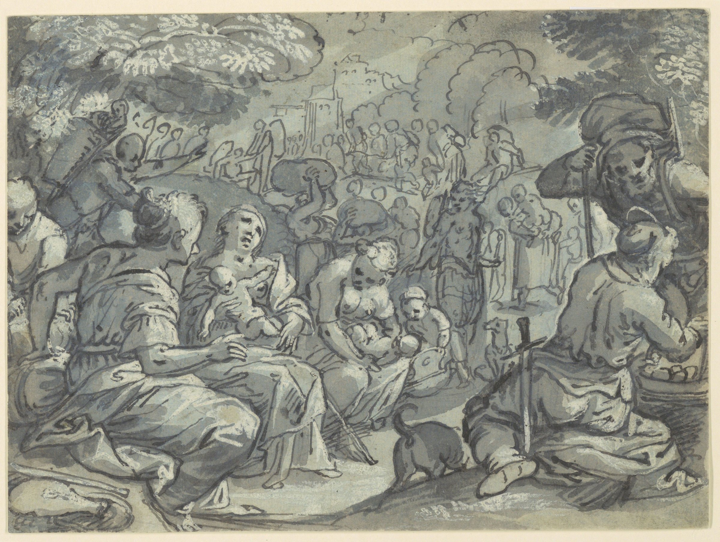 Little is known about the life and work of the Flemish history painter Adam van Noort. According to the artists’ biographer Arnold Houbraken (1660-1719), the artist was already “buried in oblivion” (“in de vergetenheid begraven”) by the time he started compiling De groote schouburgh der Nederlantsche konstschilders en schilderessen, a few decades after Van Noort’s death.1 However, he must have been an artist of some standing as his portrait is included among other leading Antwerp contemporaries in the Iconography of Anthony van Dyck (1599-1641).2 We do know that Van Noort entered the guild of St. Luke in Antwerp in 1587, presumably after an apprenticeship to the Mannerist painter Jacob de Backer (c. 1540/45-before 1600). Ten years later he was elected its dean, a highly prestigious position. During his long career, more than thirty pupils studied under him, among them Peter Paul Rubens (1577-1640) and his son-in-law Jacob Jordaens (1593-1678). Although he lived almost eighty years, his surviving oeuvre is small and only very few paintings and drawings can be securely attributed to him.3 Scene of the Exodus is not signed, but it can be compared to two drawings attributed to the artist by Hans Mielke in Cologne and Leiden,4 and a sheet catalogued as Van Noort in New York.5 There is a certain looseness in the handling of the pen and brush in these drawings, e.g. the contours are drawn with coarse pen lines and wash is freely applied over the entire sheet with a broad brush to create shadow and volume. The figures have characteristic heads, with strangely rounded foreheads, eyes and noses drawn with short dashes and dots, and long, pointy fingers. They recall the elegant, Mannerist figures in a drawing by Van Noort in Rotterdam, dated 1598.6 However, the crude draughtsmanship in these sheets contrasts with this earlier, more refined drawing and, as such, a later dating seems more plausible. Closer in style are three monogrammed illustrations for Thomas Sailius’ Thesaurus precum, meditationum ac litaniarum (1609), dated 1608.7 Van Noort specialised in religious subjects, but mythological, allegorical and genre scenes are known by him as well. The present drawing probably depicts the Israelites readying themselves to continue their journey through the desert to the Promised Land, perhaps after they have gathered the Manna provided by God (Exodus 16:1-36). In the foreground two men are bent over a basket, which appears to be filled with food, while in the background people are getting up and hoisting large bundles onto their heads and shoulders. However, Moses is nowhere to be seen. A painting on the art market, described as ‘circle of Van Noort’, depicts another episode from the Bible book Exodus: Moses striking water from the rock.8 Certain elements, such as the arrangement of figures along a diagonal axis, the repoussoir on the left with a seated woman in profile and a mother nourishing an infant also appear in Scene of the Exodus. To date, no painting by Van Noort with the same scene is known. Perhaps the artist made the highly finished sheet as an individual work of art, or it may have served as a design for a tapestry, hence the decorative floral elements added in white gouache. Van Noort was probably also employed as a tapestry designer in the workshop of Francois Spiering (1551-1630) in Delft.9 MR 1Arnold Houbraken, De groote schouburgh der Nederlantsche kunstschilders en schilderessen, 3 vols., Amsterdam 1718-21, vol. 1, pp. 37-38. 2Simon Turner, Anthonie van Dyck (The New Hollstein Dutch & Flemish etchings, engravings and woodcuts, 1450-1700), 9 vols., Rotterdam 2002, vol. 1, p. 34, no. 7. 3See for publications on Van Noort’s drawings Leo van Puyvelde, ‘Het oorspronkelijk werk van Adam van Noort, meester van Rubens’, Verslagen en mededelingen van de Koninklijke Vlaamse Academie voor Taal- en Letterkunde, Gent 1929, pp. 385-388; Christian Dittrich, ‘Drawings by Adam van Noort’, Master Drawings 10 (1972), no. 2, pp. 137-143; Hans Mielke, ‘Einige Zeichnungen Adam van Noorts’, in Essays in Northern European Art: presented to Egbert Haverkamp-Begemann on his sixtieth birthday, Doornspijk 1983, pp. 173-177. 4Cologne, Wallraf-Richartz-Museum, inv. no. Z. 1835 (pen and brown ink, with brown wash; 186 × 293 mm); Leiden, University Library, inv. no. PK-T-AW-657 (pen and brown ink, with brown wash; 189 × 141 mm); see Mielke 1983, op. cit. (note 3), pp. 176-177, figs. 7-8. 5New York, Metropolitan Museum, inv. no. 2005.389 (pen and brown ink, with brown wash, over a sketch in black chalk; 180 × 224 mm. Inscribed on verso, lower right, in a seventeenth-century hand, in brown ink: “adam van noort”); see http://www.metmuseum.org/art/collection. 6Rotterdam, Museum Boijmans Van Beuningen, inv. no. MB 1767 PK (pen and brown ink, with brown and grey wash, over a sketch in black chalk; 266 × 191 mm. Monogrammed, lower right, in brown ink (interwoven): “AVN”. Signed, and dated, lower right, in brown ink: “1589 / Adam van Noort”); see G. Luijten, ‘De Triomf van de Schilderkunst: een titeltekening van Gesina ter Borch en een toneelstuk’, Bulletin van het Rijksmuseum 36 (1988), no. 4, p. 291, fig. 11; and http://collectie.boijmans.nl. 7Antwerp, Museum Plantin-Moretus, inv. nos. MPM.TEK.383, MPM.TEK.385 and MPM.TEK.386 (pen and brown ink, with brown wash; indented for transfer; approx. 130 × 80 mm); see Mielke 1983, op. cit. (note 3), p. 174, fig. 6 (only MPM.TEK.383); and http://search.museumplantinmoretus.be/search/simple. 8Sale, Amsterdam (Christie’s), 28 November 1989, no. 69, as ‘circle Adam van Noort’. 9Ger Luijten and Ariane van Suchtelen, Dageraad der Gouden Eeuw: Noordnederlandse Kunst 1580-1620, exh. cat., Amsterdam (Rijksmuseum) 1993, p. 317.