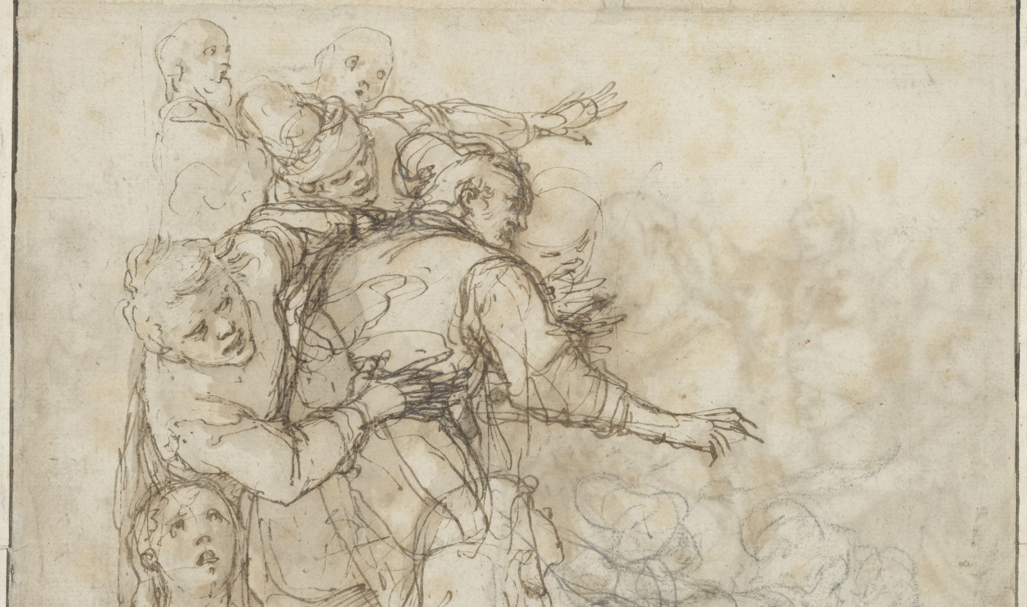 Accueil Catalogues en ligne Studi & Schizzi II. Assembler les figures Les interactions liant les personnages dans une œuvre sont un élément essentiel de la qualité du récit qui s’y déploie. Les artistes multiplièrent les dessins pour trouver des solutions formelles à la restitution, en deux dimensions, d’une relation qui se développait en réalité dans l’espace. Grâce à la spontanéité des esquisses, ils pouvaient tourner, rapprocher, réarranger les figures ou les observer sous différents angles, pour évoquer la dynamique et la diversité des réactions au sein d’un groupe ou la multitude presque abstraite d’une foule.L’iconographie de la Vierge à l’Enfant, très largement déclinée dans l’art italien de cette époque, était propice à l’examen des contacts physiques ou platoniques qui pouvaient lier deux figures. Dans ces études, l’expressivité des gestes et des regards permettait au dessinateur d’explorer le caractère intime ou dévotionnel de la relation qui unissait Marie et son enfant, et qui conférait à l’œuvre l’atmosphère spirituelle désirée. E da cio’ nasce l’invenzione, la quale fa mettere insieme in istoria le figure a quattro, a sei, a dieci, a venti, talmente ch’e’ si viene a formare le battagle e l’altre cose grandi dell’arte. À partir de là, [l’artiste] sera capable d’inventer, c’est-à-dire de composer des scènes en assemblant quatre, six, dix, vingt figures ou plus, jusqu’à représenter des batailles ou d’autres grands sujets de l’art. Giorgio Vasari, Le Vite de’ più eccellenti pittori, scultori, e architettori, Florence, 1550 36. Girolamo Genga Urbino vers 1476 – 1551 Urbino Cette étude est préparatoire au Mariage mystique de sainte Catherine (Galleria Nazionale di Palazzo Barberini, Rome), un tableau qui trahit l’influence de l’art de Raphaël, que Genga côtoya dans l’atelier de Perugino. Dans notre feuille, Genga se montra particulièrement attentif à la spatialité (…) 37. Suiveur de Pietro Vannucci, dit Perugino Castello della Pieve 1446/1447 – 1523 Fontignano Cette page réunit les fragments de deux feuilles d’études pour des Madones, assemblés par un collectionneur sans doute au XVIIIe siècle. Le dessinateur, se désintéressant de l’exactitude anatomique des figures, se concentra davantage sur la manière de représenter leur relation. Il fit varier (…) 38. Giovanni di Pietro, dit Lo Spagna Perugia vers 1450 – 1528 Spoleto Les mains jointes en prière, la Vierge couve du regard l’enfant Jésus allongé sur ses genoux. Son geste souligne le caractère sacré de cette étude, sans doute préparatoire à une commande religieuse, mais il n’enlève rien à l’affection perceptible à travers l’échange tendre des regards. Le visage (…) 39. Battista Franco, dit Semolei Venise vers 1498/1510 – 1561 Venise Dessinateur talentueux, Battista Franco développa un style expressif, caractérisé par une ligne fine et bouclée qui ne semble jamais s’interrompre. Dans la feuille de la Fondation Custodia, les formes et les figures naissent de l’enchevêtrement de ces volutes. Franco accentua les traits des (…) 40. Lorenzo Sabatini Bologne vers 1530 – 1576 Rome Le premier tracé à la pierre noire qui transparaît encore sous la sanguine permit à Sabatini de mettre en place son dessin, qu’il rehaussa ensuite de lavis et de gouache blanche. Il porta un grand soin à la réalisation de cette Vierge à l’Enfant, qu’il mit au carreau pour pouvoir la transférer (…) 41. Domenico Zampieri, dit Domenichino Bologne 1581 – 1641 Naples Notre feuille et celle de Darmstadt sont chacune liées à deux grandes compositions religieuses peintes par Domenichino, respectivement à San Lorenzo in Miranda et au Palazzo Barberini à Rome. Elles appartiennent à la même typologie des études de figures à la pierre noire sur papier gris-bleu qui (…) 42. Pietro da Cortona Cortona 1596 – 1669 Rome Pietro da Cortona fut l’un des grands représentants de l’art baroque italien. Il développa une manière graphique diligente comme en témoignent notre dessin ou celui de Würzburg, tous deux préparatoires au tableau du Repos pendant la fuite en Égypte (1638, église de Walterskirchen, Autriche). (…) 43. Giovanni Benedetto Castiglione Gênes 1609 – 1664 Mantoue Castiglione fut l’une des personnalités les plus originales de l’art baroque italien. Inspiré sans doute par les esquisses de Rubens et Van Dyck qui furent actifs à Gênes au début du XVIIe siècle, il élabora une technique de dessin à l’huile sur papier tout à fait singulière. De sa facture vive (…) 44. Giovanni Francesco Barbieri, dit Guercino Cento 1591 – 1666 Bologne Cette étude est une première pensée pour Le Christ ressuscité apparaissant à la Vierge (1628-1630, Pinacoteca Civica, Cento), un des tableaux les plus majestueux de Guercino. L’artiste dessina les figures à mi-corps, délaissant ici les amples drapés qui jouèrent un rôle visuel très fort dans la (…) 45. Alessandro Maganza Vicenza 1556 – après 1632 Vicenza Sur une esquisse à la pierre noire, Alessandro Maganza dessina de sa plume vive et fluide ces deux figures. Contrairement à l’iconographie plus courante du Noli me tangere où le Christ repousse Madeleine, ici il attire à lui une sainte agenouillée. L’habit de nonne n’est pas suffisamment précis (…) 46. Francesco Mazzuola, dit Parmigianino Parme 1503 – 1540 Casalmaggiore Cette œuvre de Parmigianino compte parmi ses dessins les plus admirés et fut reproduite en gravure dès le XVIIIe siècle. L’artiste chercha vraisemblablement à rapprocher très étroitement les deux personnages, allant jusqu’à contracter l’espace pourtant nécessaire aux jambes de l’homme qui (…) 47. Domenico Beccafumi Valdibiena 1486 – 1551 Sienne Ce dessin magistral de Domenico Beccafumi s’apparente, par son sujet et son exécution, aux gravures