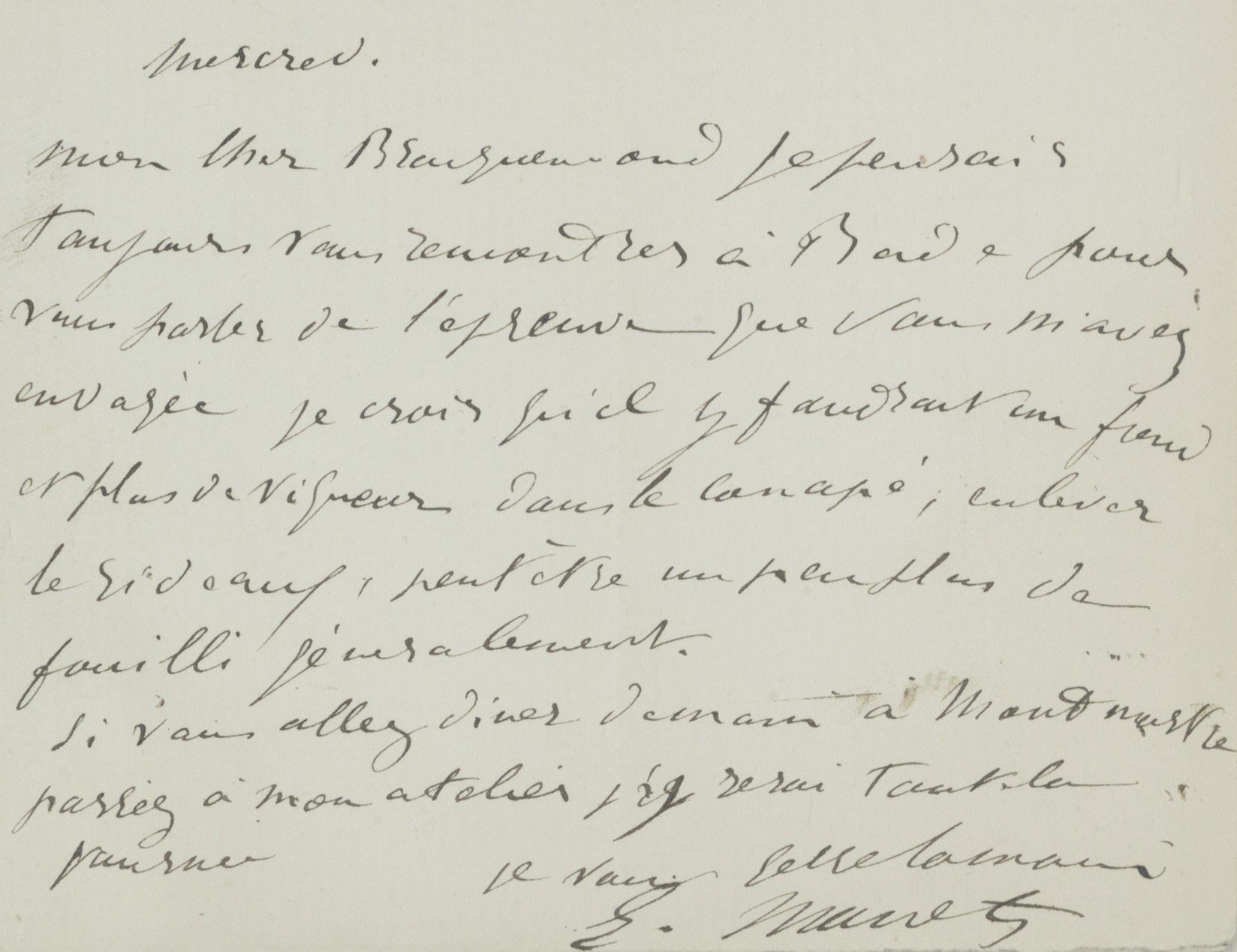 Nouvelle publication Les lettres recemment découvertes d’Édouard Manet à son ami Félix Bracquemond Dans le cadre de la série The Fondation Custodia Studies in the History of Art, la Fondation Custodia s’associe à l’éditeur anglais Ad Ilissvm pour la publication de l’ouvrage Manet to Bracquemond : Newly Discovered Letters to an Artist and Friend qui analyse la correspondance quasi inconnue des lettres adressées par Édouard Manet (1832–1883) à son ami l’artiste Félix Bracquemond (1833–1914). Cette correspondance a été acquise en 2017 par la Fondation Custodia, avec le généreux soutien de Jean-Luc Baroni. Elle est présentée ici pour la première fois par Jean-Paul Bouillon, dont le travail de longue date sur la vie et l’œuvre de Bracquemond lui a permis de situer avec précision les lettres pour la plupart non datées et d’examiner leur contenu dans le contexte de la carrière des deux artistes. Publiées dans leur langue française d’origine, ces lettres d’exception sont accompagnées de commentaires en anglais sur leur datation et leur sujet, et la plupart des œuvres évoquées dans les textes sont reproduites en couleur. Les lettres sont précédées d’une introduction complète sur l’amitié entre les deux hommes et met en évidence les principaux thèmes autour desquels s’articule la correspondance au fil des ans. Lettres d’Édouard Manet à Félix Bracquemond : deux billets non datés Fondation Custodia, Collection Frits Lugt, Paris, inv. 2017-A.1 Bracquemond et Manet se sont probablement rencontrés vers 1860, à une époque où Manet commençait à s’intéresser au potentiel de la gravure pour diffuser son travail. De nombreuses lettres attestent des contacts fréquents, parfois presque quotidiens, entre les deux hommes, qui avaient l’habitude de se retrouver dans l’atelier de Manet, mais aussi dans les cafés d’artistes (café de Bade et le Guerbois), et lors des dîners avec Manet, sa femme et sa mère. D’autres lettres concernent des projets communs, tel l’illustration de la brochure d’Émile Zola publiée à l’occasion de l’exposition personnelle de Manet de 1867, ou l’ex-libris de Manet dessiné par Bracquemond en 1875. Le lien fort entre les deux hommes ressort clairement de deux lettres plus longues dans lesquelles Manet ouvrit son cœur à Bracquemond au sujet de la situation politique du moment. Ces lettres arrivèrent d’Arcachon, où il attendait la fin de la Commune en essayant de se remettre des privations dont il avait souffert pendant le Siège de Paris en 1870. Cette correspondance est une source importante pour la connaissance de la vie et des relations de Manet qui, après plus d’un siècle de recherches intenses, présente encore de nombreuses lacunes. Félix Bracquemond, d’après une photographie d’Anatole Godet, Portrait d’Édouard Manet, 1867 Eau-forte, 160 × 119 mmBritish Museum, Londres Édouard Manet, Portrait de Félix Bracquemond, 1865 Aquatinte, 172 × 113 mmBritish Museum, Londres L’ouvrage est écrit par Jean-Paul Bouillon, Professeur émérite d’histoire de l’art à l’Université Clermont-Auvergne et membre honoraire de l’Institut universitaire de France. Ses nombreuses publications comprennent des éditions d’écrits de critiques d’art (de Goncourt, Zola) et d’artistes (Kandinsky, Denis) ; des monographies sur Maurice Denis (1993 et 2006) et Gustav Klimt (1986) ; et des études sur les mouvements Art nouveau et Art déco. Il est un spécialiste reconnu de la vie et de l’œuvre de Félix Bracquemond, dont il a compilé la première partie d’un catalogue raisonné de l’œuvre graphique (1987). Il a consacré en outre trois monographies à cet artiste, liées à des expositions en 2003, 2004, 2005 et a rendu l’œuvre théorique principal de Bracquemond nouvellement accessible dans une édition critique (Du dessin et de la couleur, 2010).